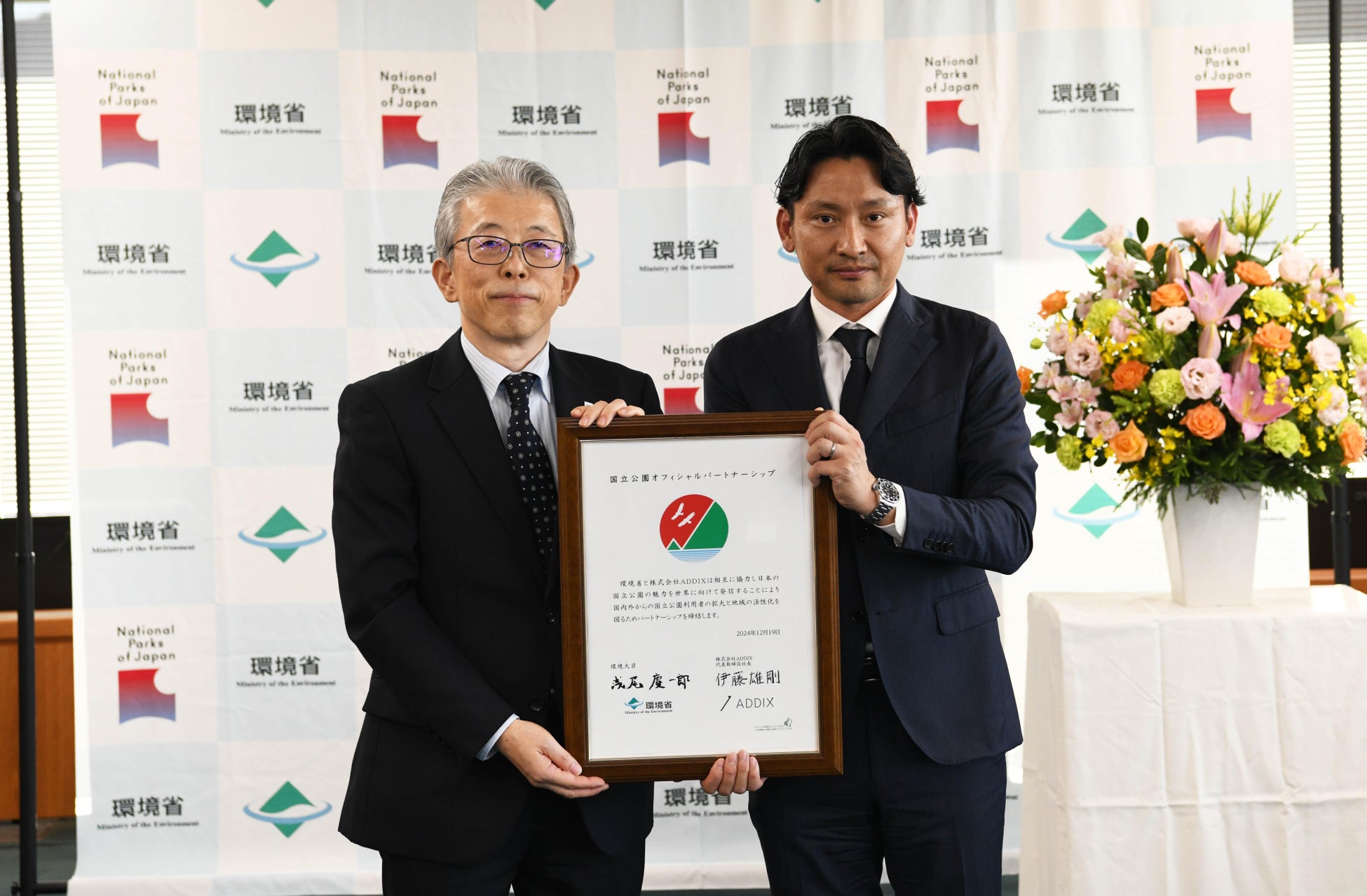 株式会社ADDIX(所在地:東京都港区、代表取締役社長:伊藤雄剛 以下、ADDIX)は、2024年12月19日に環境省と「国立公園オフィシャルパートナーシップ」を締結いたしました。環境省 植田明浩 自然環境局長出席のもと、同日執り行われた締結式には、弊社代表取締役社長の伊藤雄剛が参加しました。第13回目を迎えた締結式では、新たにパートナーシップを締結する企業等9社が参加し、今回をもって全146社・団体がオフィシャルパートナーとなっています。