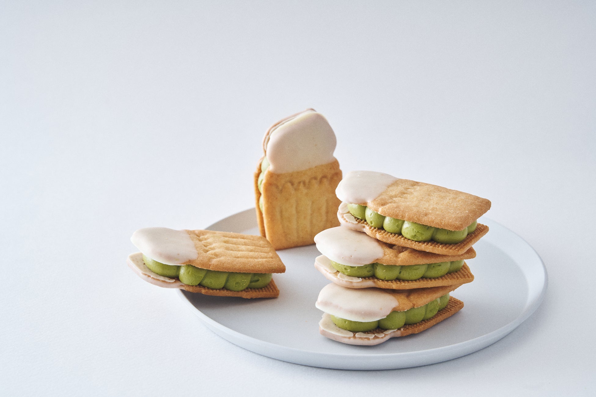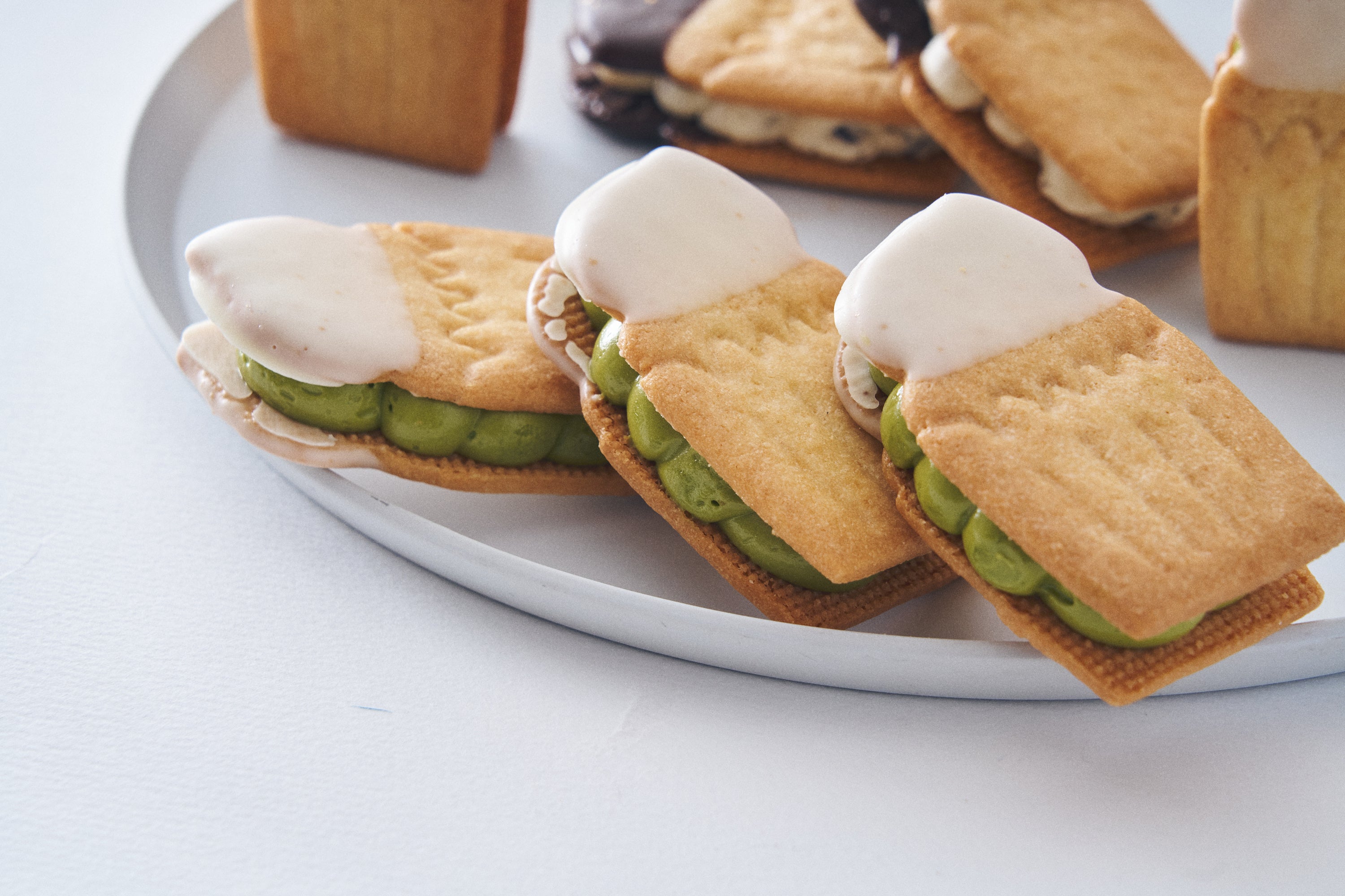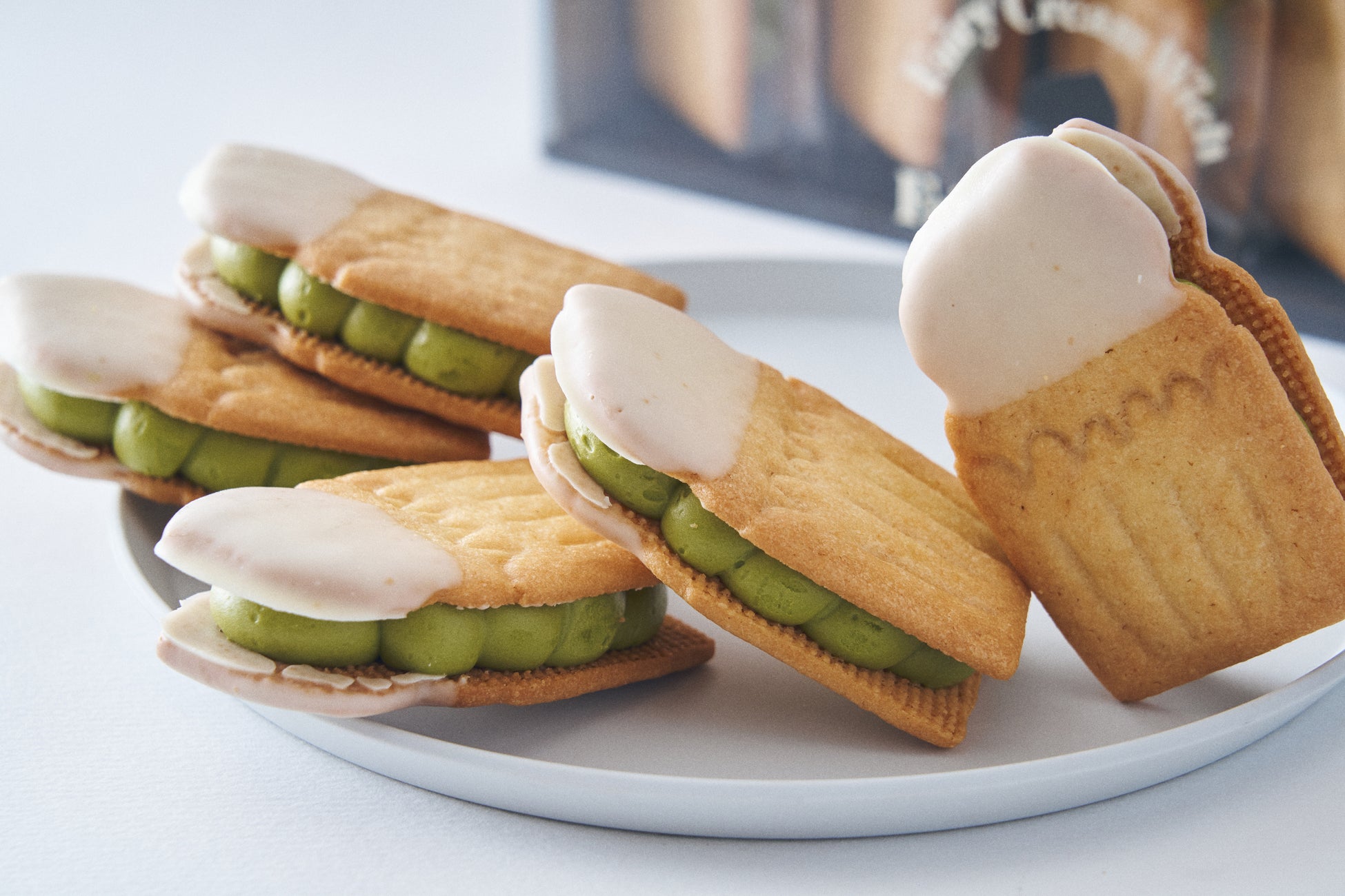 宇治抹茶生チョコ仕立ての生バタークリームとホワイトチョコレートチップを、丁寧に焼き上げた香ばしいビスケットで一つ一つサンド。クリームのなめらかな口溶けに、粒チョコ食感のアクセントが特徴の“特製生バターサンド”です。