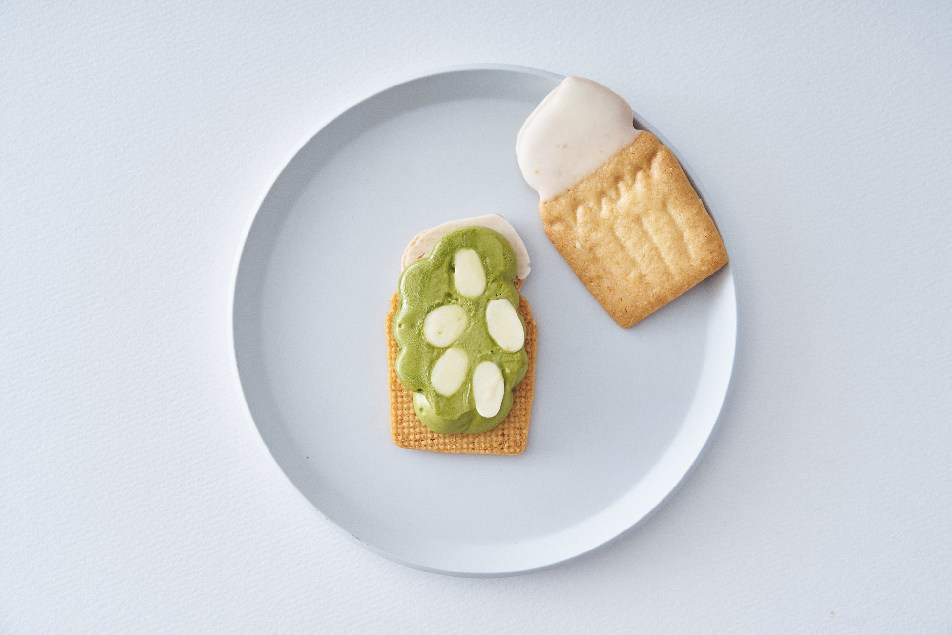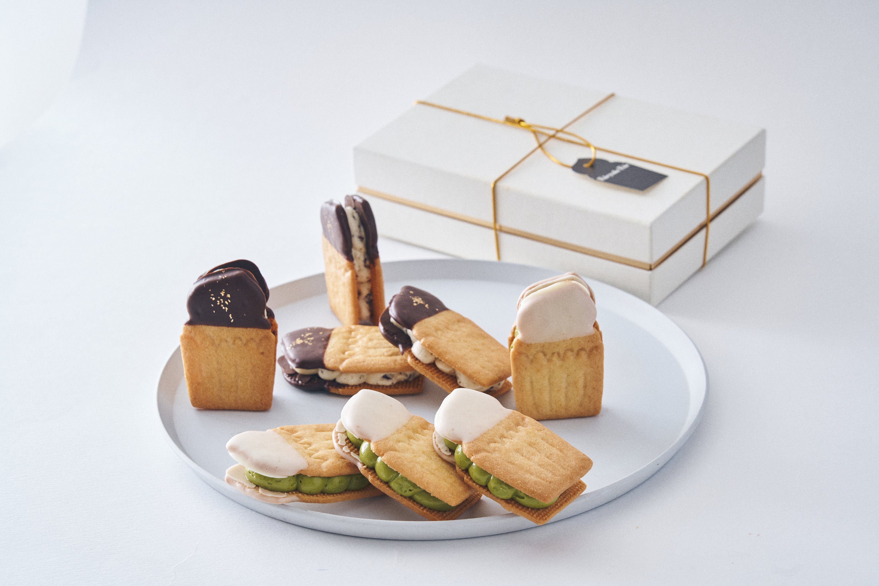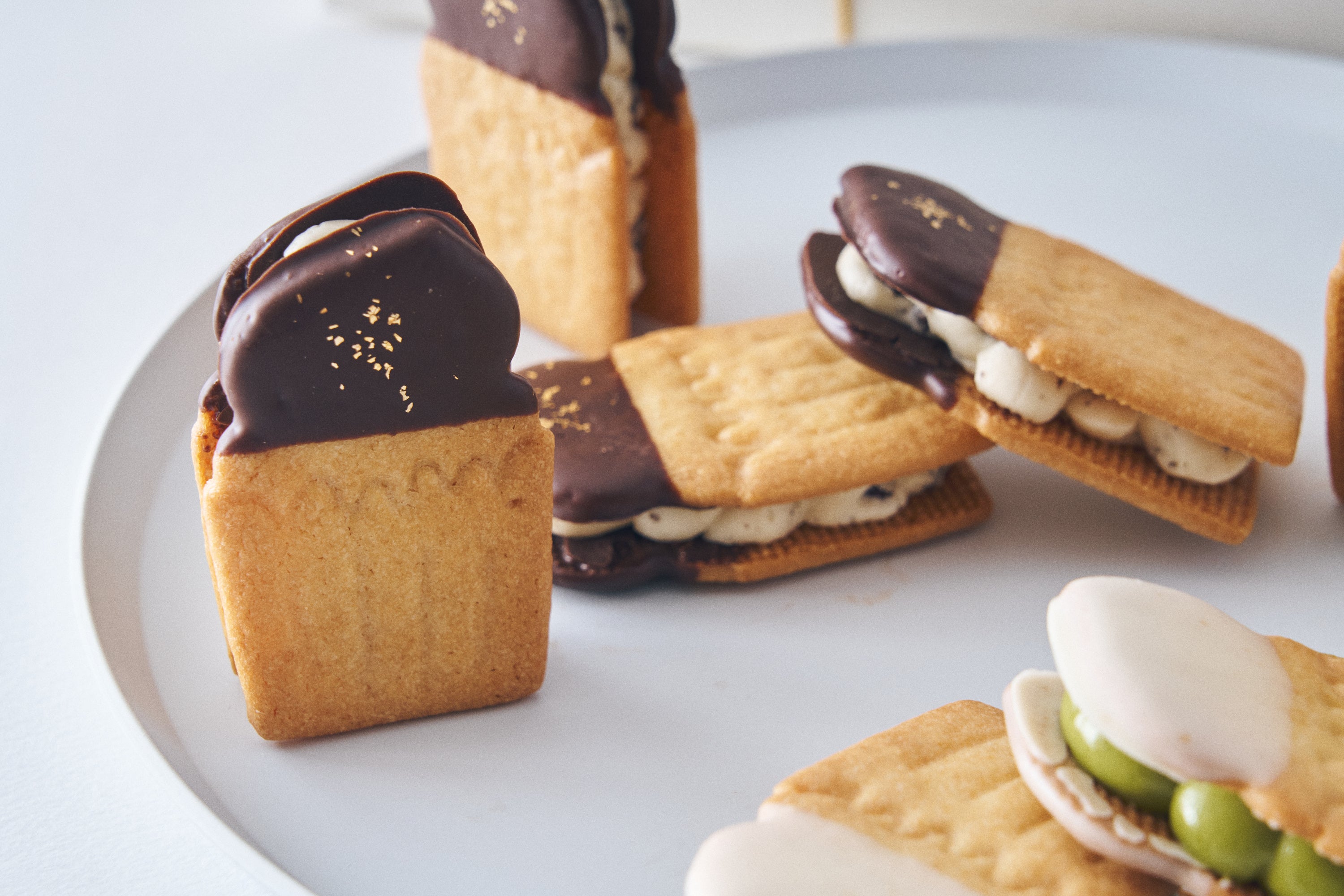 宇治抹茶生チョコ仕立ての生バタークリームとホワイトチョコレートチップを、丁寧に焼き上げた香ばしいビスケットで一つ一つサンド。クリームのなめらかな口溶けに、粒チョコ食感のアクセントが特徴の“特製生バターサンド”です。