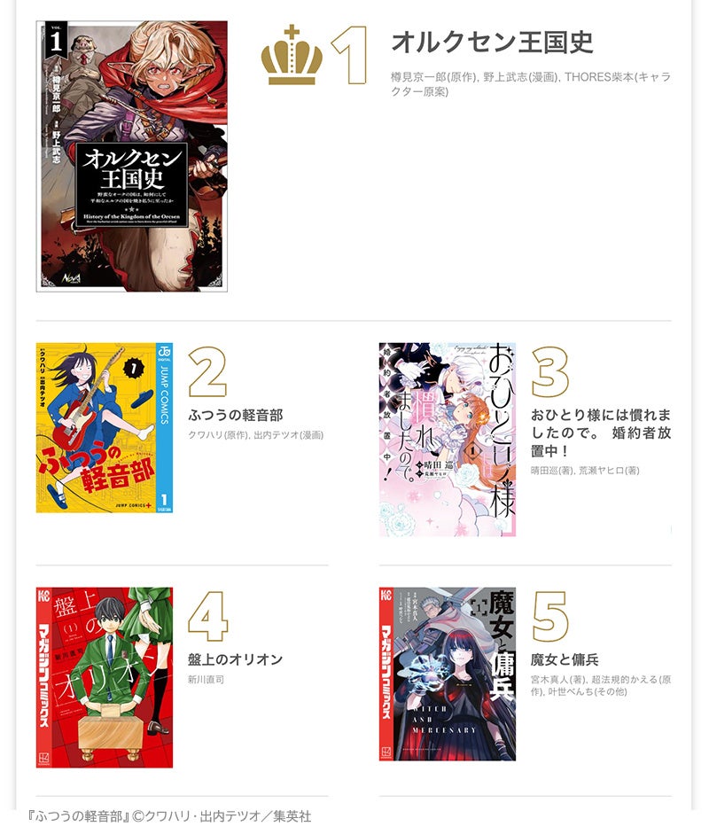 「ジャンプ+」(集英社)での昨年の連載開始から話題を呼んだ『ふつうの軽音部』はReader Storeでも注目を集め、最終的に第2位に。第4位の『盤上のオリオン』は、「将棋マンガ特集」でも取り上げ多くの方に読んでいただきました。
