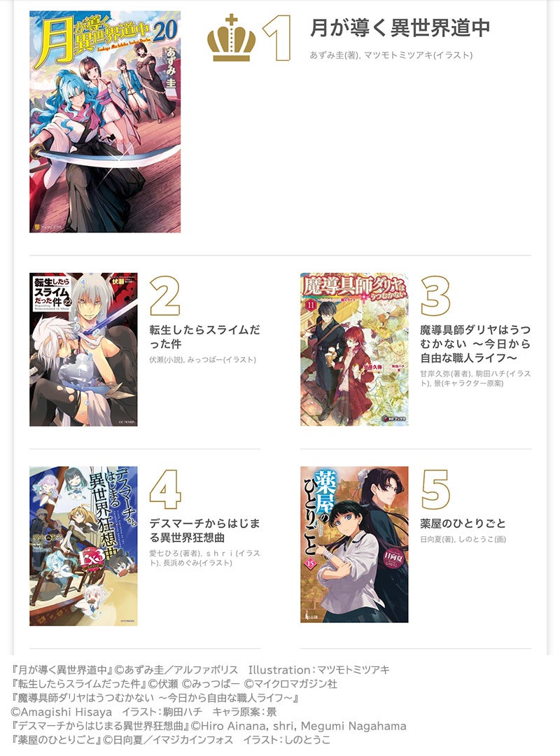 ライトノベルは、人気タイトルの『月が導く異世界道中』がアニメ第2期の放送を機にさらに売り上げを伸ばし、最新第20巻の初日売り上げはシリーズ過去最高を記録し、第1位となりました。