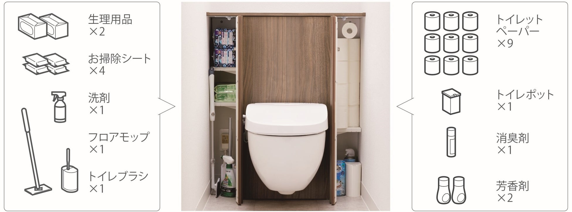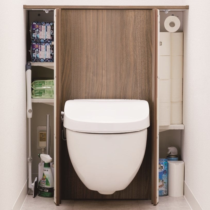 デッドスペースだった便器横はキャビネットの奥行を活かし、新モデルでは大容量の扉式収納にすることで、収納量を大幅に増加し、使い勝手も向上しました。できれば隠したいお掃除ブラシや洗剤、ストックを置いておきたいトイレットペーパーなどトイレ空間に必要なものをキャビネットの中にたっぷり収納でき、見た目もすっきりします。