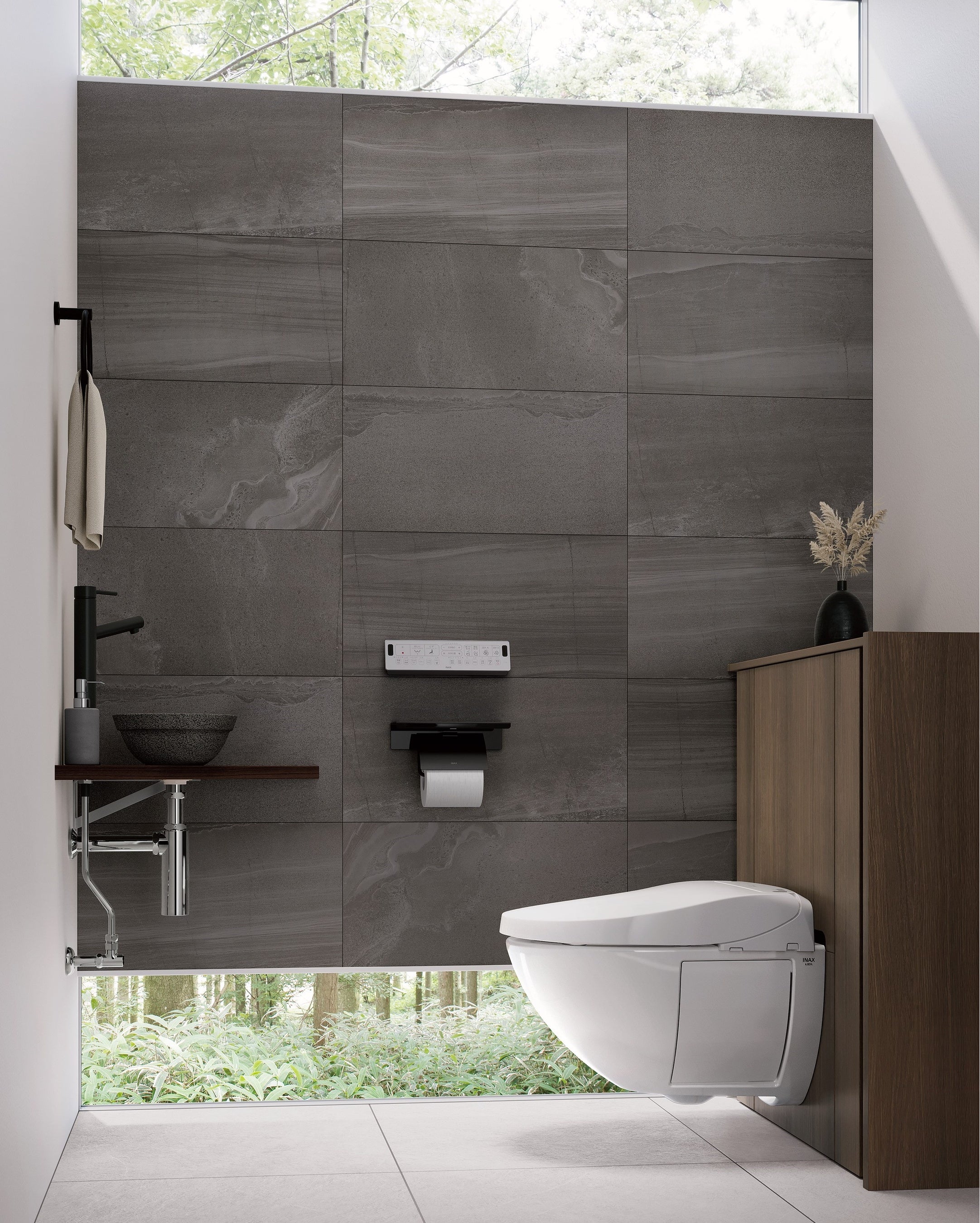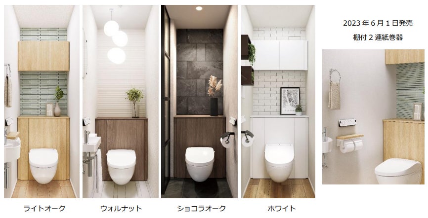 キャビネットのパネルカラーは、周辺アイテムや他素材と組み合わせやすく、空間馴染みのよい低彩度な木目カラー3色とホワイト1色から選択可能です。同日から発売する「棚付2連紙巻器」は、フロート トイレと同じカラーを用意しているほか、アッパーキャビネットにも同色をそろえています。また、2023年4月から発売している「オールインワン手洗」や、調湿やニオイ吸着といった機能を有する「エコカラットプラス」などと組み合わせ、カウンターには小物を飾るなどすることで、トイレ空間をデザイン、使い勝手ともに自分好みにコーディネートできます。