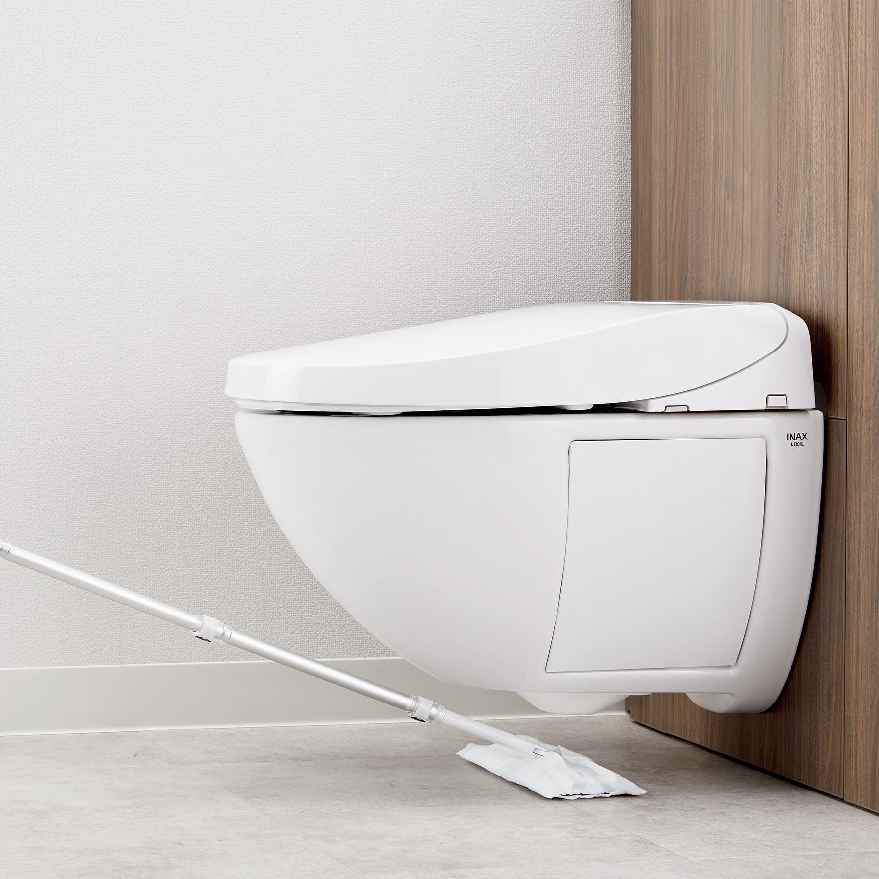 住宅用としては新しい、便器を床から浮かせた壁掛スタイルで、足元をすっきりさせ、トイレ空間を広々と見せることができるトイレです。これにより、同じ広さのトイレでも入った時に感じる空間全体の印象もアップします。また、トイレを浮かせることで、清掃性もアップしています。便器と床のすき間は約7cmあり、便器の前側が丸みを帯びているため、お掃除モップなどが奥まで届きさっと一拭きで済ますことができます。