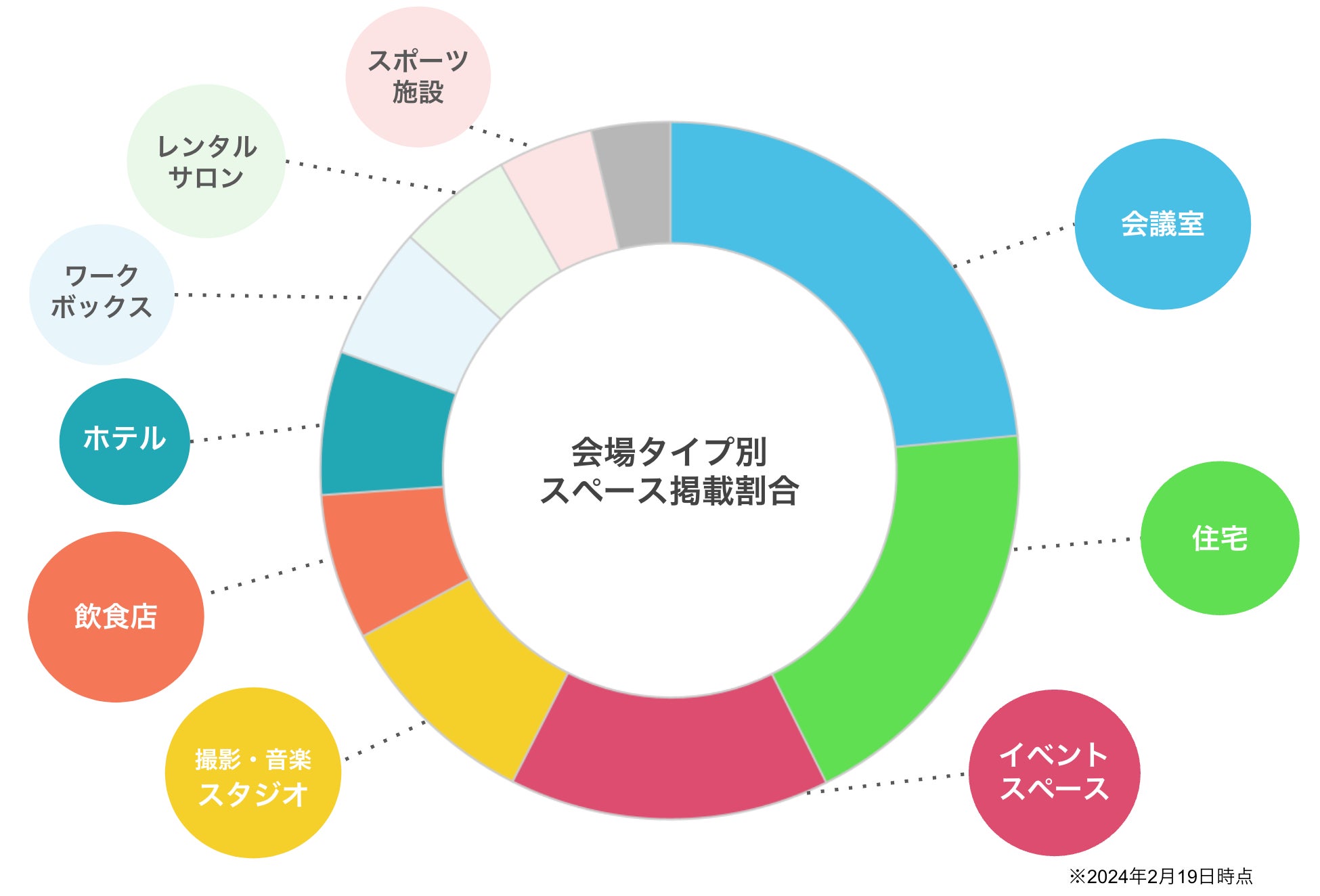 スペースマーケットは2014年4月にサービスを開始して以来、会議室、住宅、撮影スタジオ、映画館、ビルの屋上などあらゆるスペースが掲載され、会議やテレワークなどのビジネス利用をはじめ、パーティー、撮影、動画配信、フィットネスなど幅広い用途で利用いただいております。
