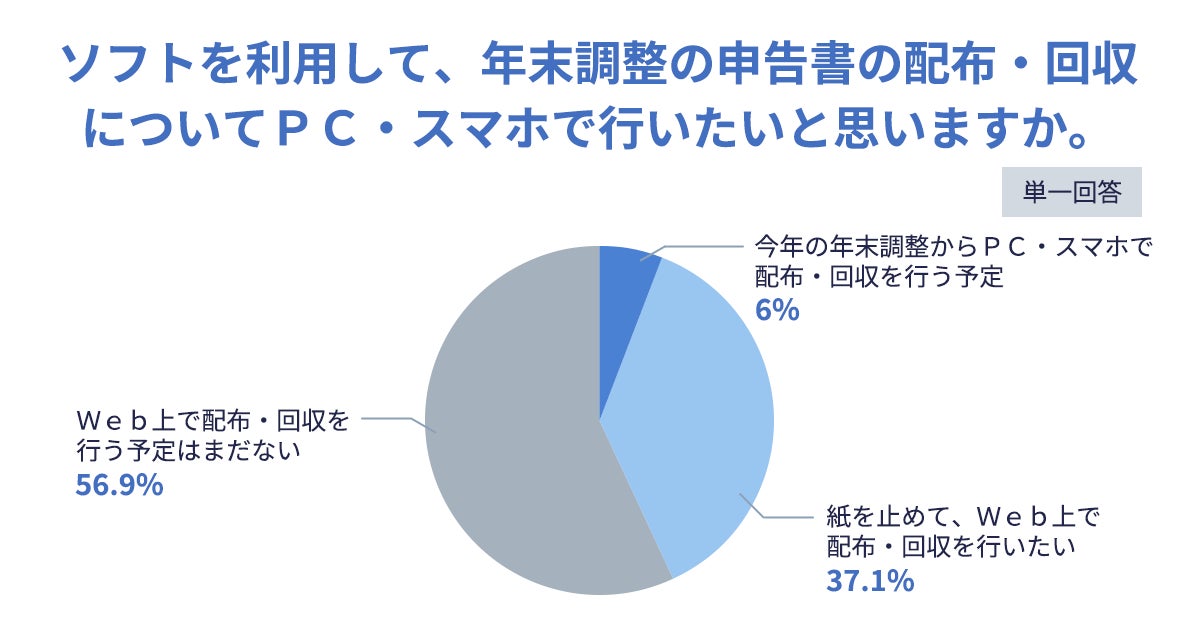 また、従業員にどのように申告書類の配布・回収を行ったか聞いたところ、給与計算ソフトの利用が42.8%、国税庁の年末調整ソフトの利用が9.2%と、合わせて5割以上がソフトを活用していることが明らかとなりました。従業員100名以下の中小企業においても、ソフトの利用がスタンダードになっている状況が伺えます。