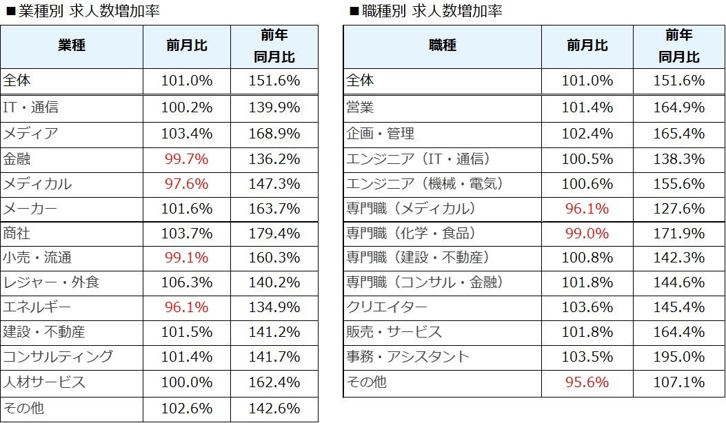 求人数は、業種別では12業種のうち8業種で前月から増加しました(「その他」は除外)。最も増加率が大きかったのは「レジャー・外食」(前月比106.3%)、次いで「商社」(前月比103.7%)でした。職種別でも11職種のうち9職種で増加し(「その他」は除外)、増加率が最も大きかったのは「クリエイター」(前月比103.6%)、次いで「事務・アシスタント」(前月比103.5%)となりました。