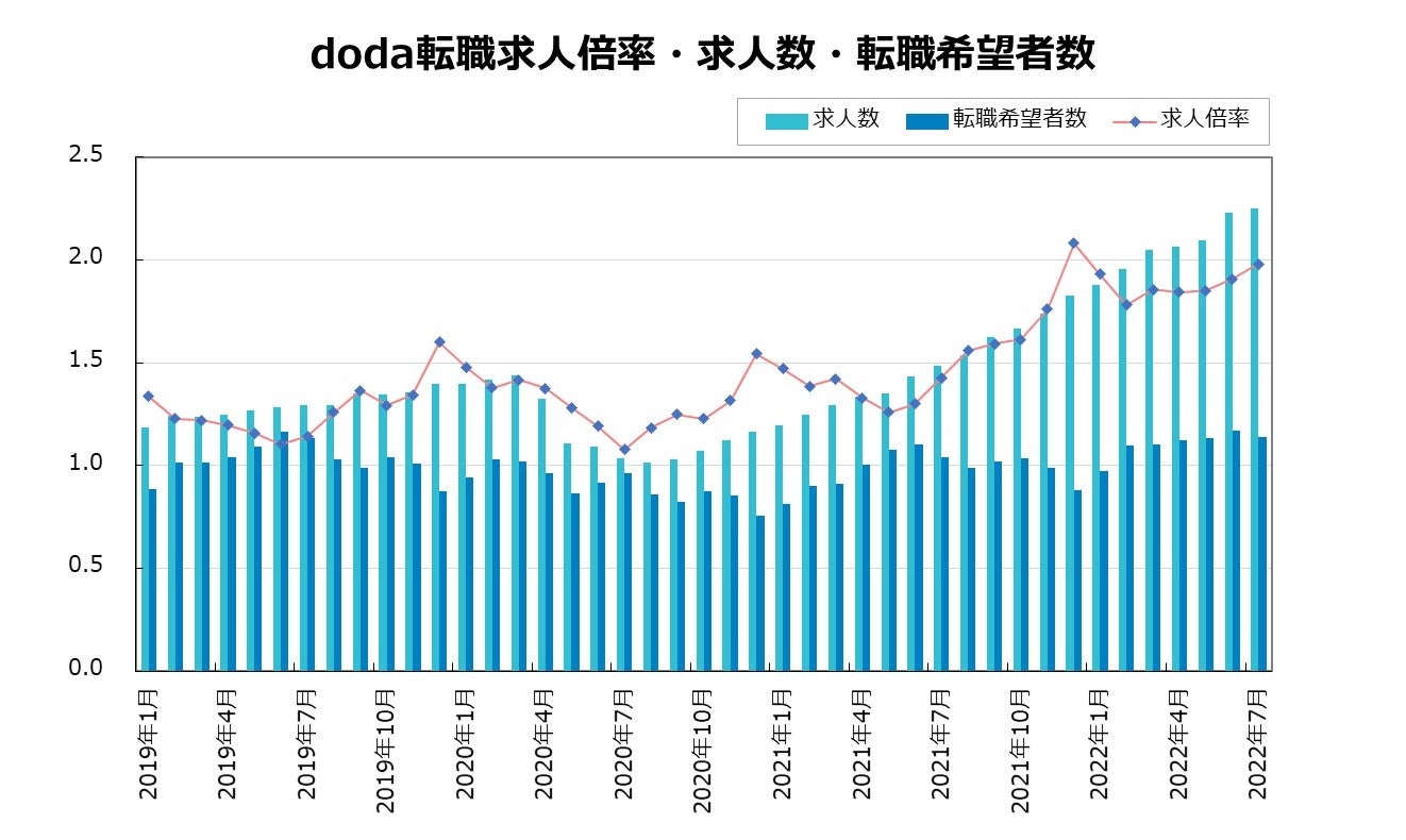 doda転職求人倍率 2022年7月は1.98倍(前月差+0.07ポイント)