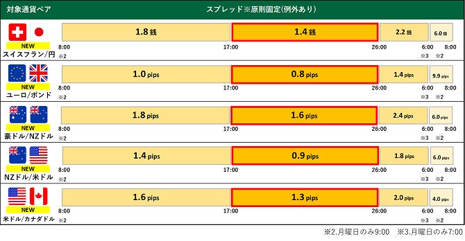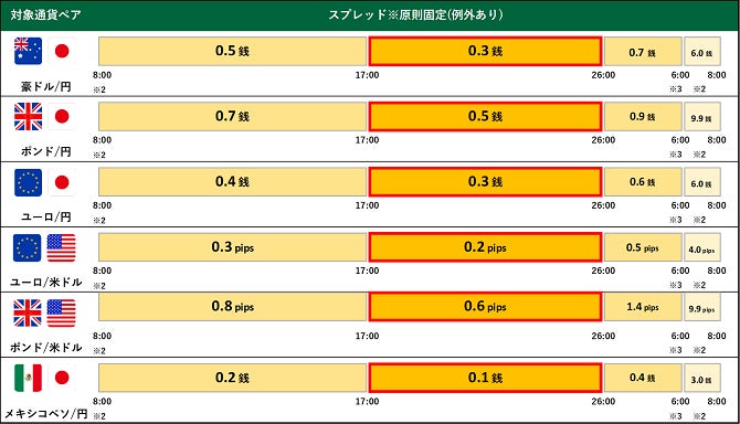 また、一部の通貨ペアでは、8時~12時のスプレッドを縮小し、早朝時間帯を除く午前中も、より狭いスプレッドでお取引いただけるようになりました。ぜひこの機会に業界最狭水準スプレッドをご体感ください。