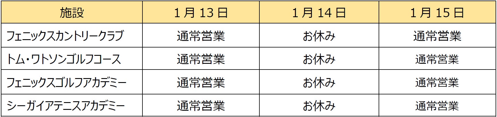 フェニックス・シーガイア・リゾート(フェニックスリゾート株式会社/宮崎市:代表取締役社長 ⼭本俊祐)は、宿泊部門を2026年1月13日(火)~1月15日(木)の3日間、スポーツ部門を同年1月14日(水)の1日間で「全施設一斉休館日」を実施いたします。