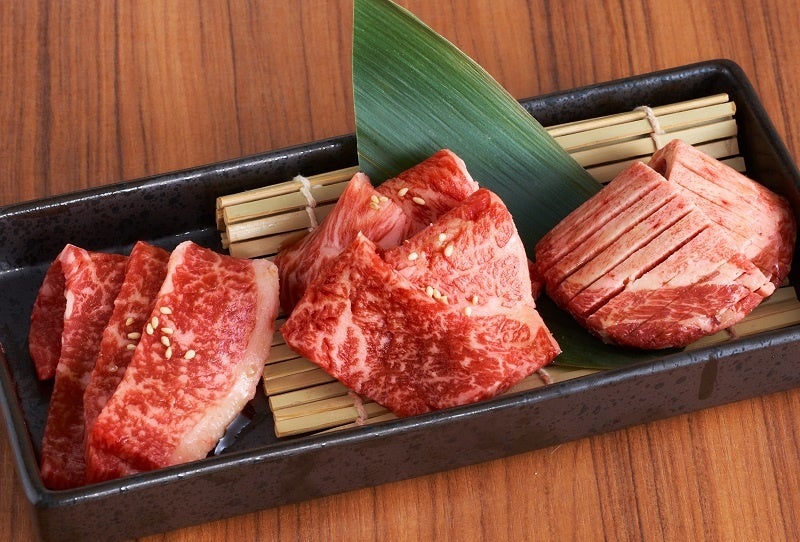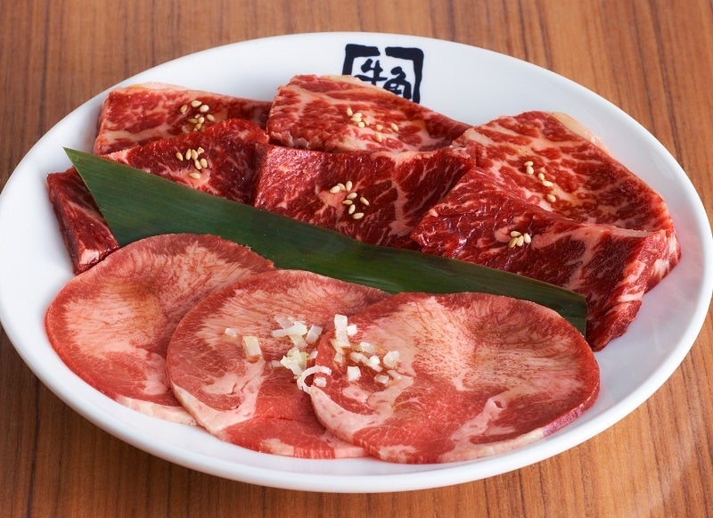 人気No1の牛タン塩、赤身とサシのバランスが良い牛角上カルビ、30日間熟成したやわらかな上ハラミの3種を盛り合わせにしました。1皿約120g。