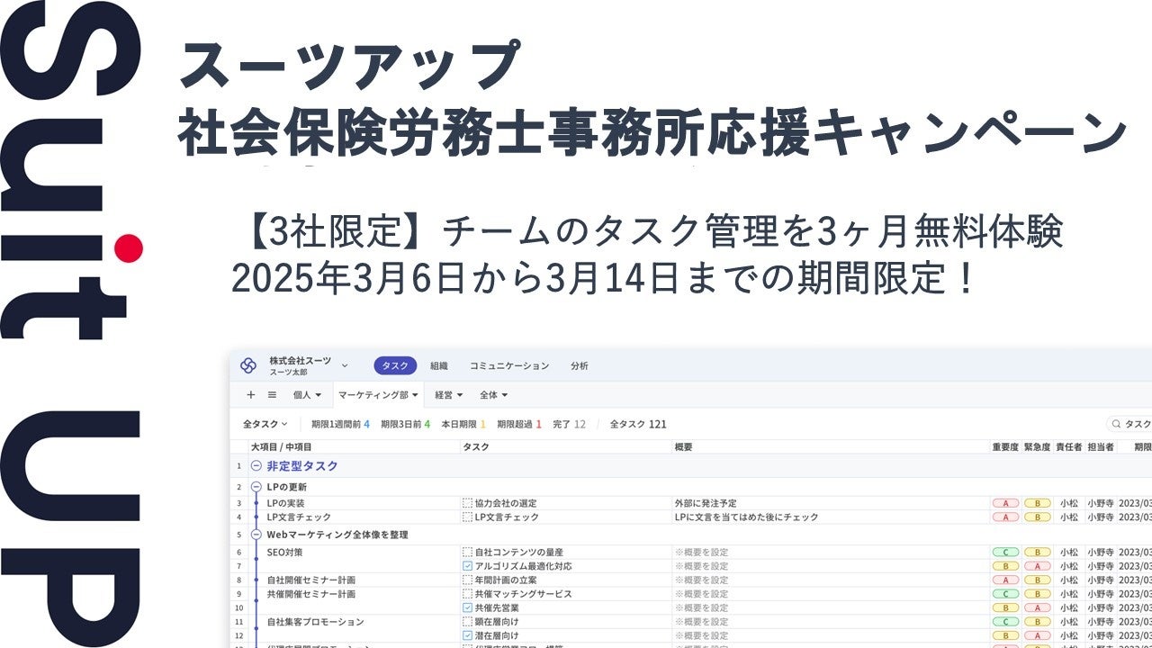株式会社スーツ(所在地:東京都千代田区、代表取締役社長CEO:小松 裕介)は、チームでかんたん、毎日続けられるプロジェクト・タスク管理ツールの経営支援クラウド「Suit UP」(スーツアップ)において、社会保険労務士事務所応援キャンペーンを実施いたします。