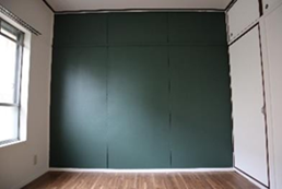 ・LDK:I think Green(黒板塗料)(視覚的リラックス効果を狙い、趣味・仕事の作業スペースにも適した空間。黒板塗料により、壁に絵やメモを書き込むことも可能。)