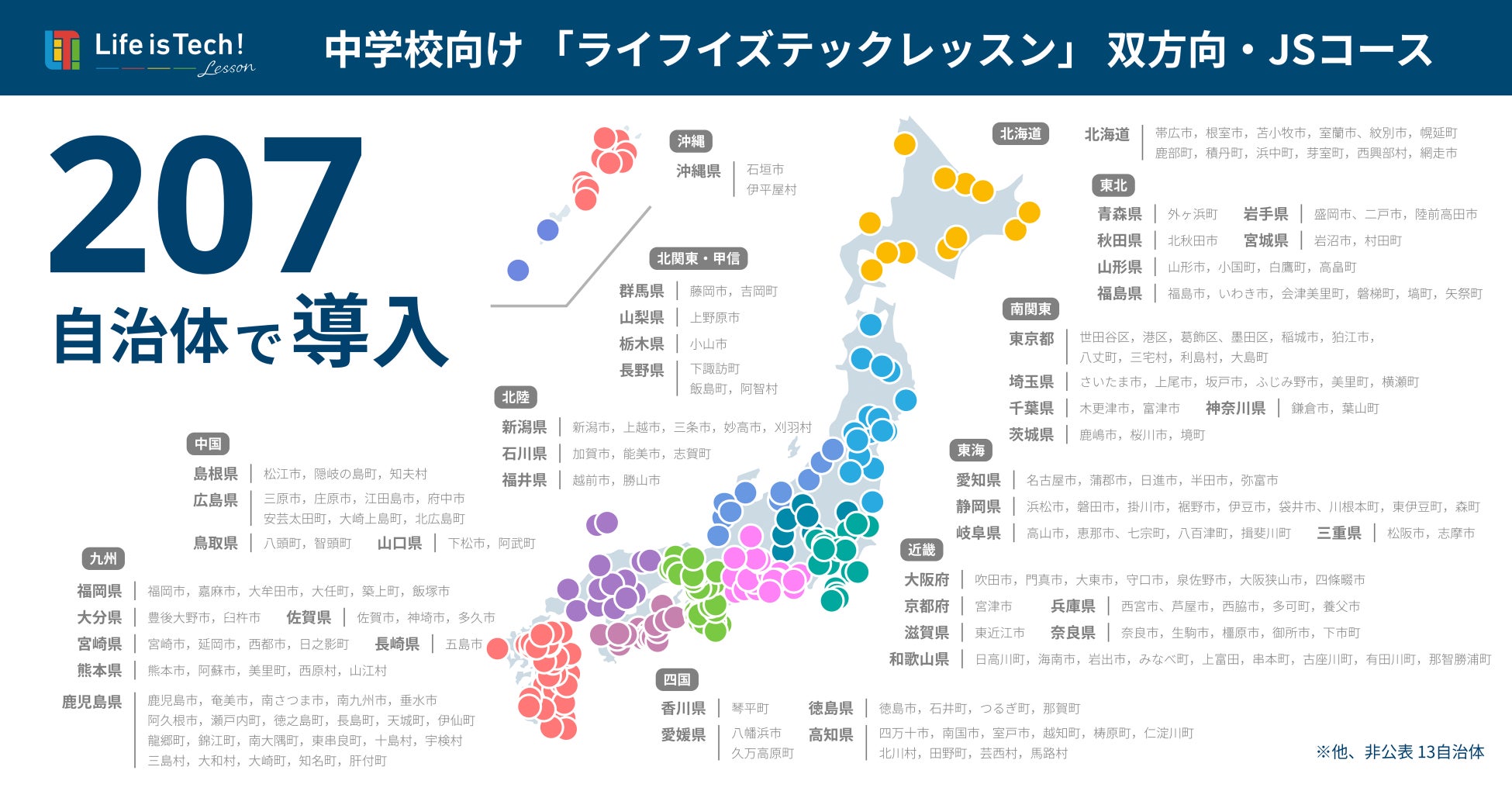 プログラミング教育サービス事業を手がけるライフイズテック株式会社(本社:東京都港区、代表取締役CEO:水野 雄介)は、中学・高校向けプログラミング学習用EdTech教材「Life is Tech ! Lesson(ライフイズテック レッスン)」の導入自治体数が600を超えたことをご報告いたします。2024年8月時点で、600自治体、4,400校の公立・私立学校に導入され、約135万人の中学・高校生に利用いただいています。また20都道府県、および207市区町村では、自治体主導で、域内の公立中学・高校に導入いただいています。