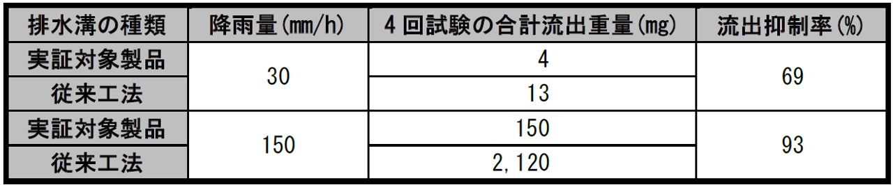 NHドレーンでは従来工法に比べ、ゴムチップ充填材を主とするプラスチック片の流出量が少ないことが分かりました。流出抑制率は、降雨量が30mm/h の条件では69%、降雨量が150mm/h の条件では93%となり、実証する性能(50%以上)を満たしました。