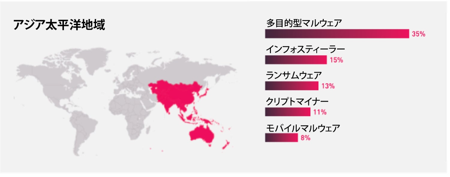 また、サイバー攻撃の種類別にみると、アジア太平洋地域では全体の攻撃数において多目的型マルウェアが35%を占め、首位となりました。情報摂取型マルウェアのインフォスティーラー(15%)、ランサムウェア(13%)、暗号資産をマイニングするクリプトマイナー(11%)、モバイル端末を狙うモバイルマルウェア(8%)が続きます。