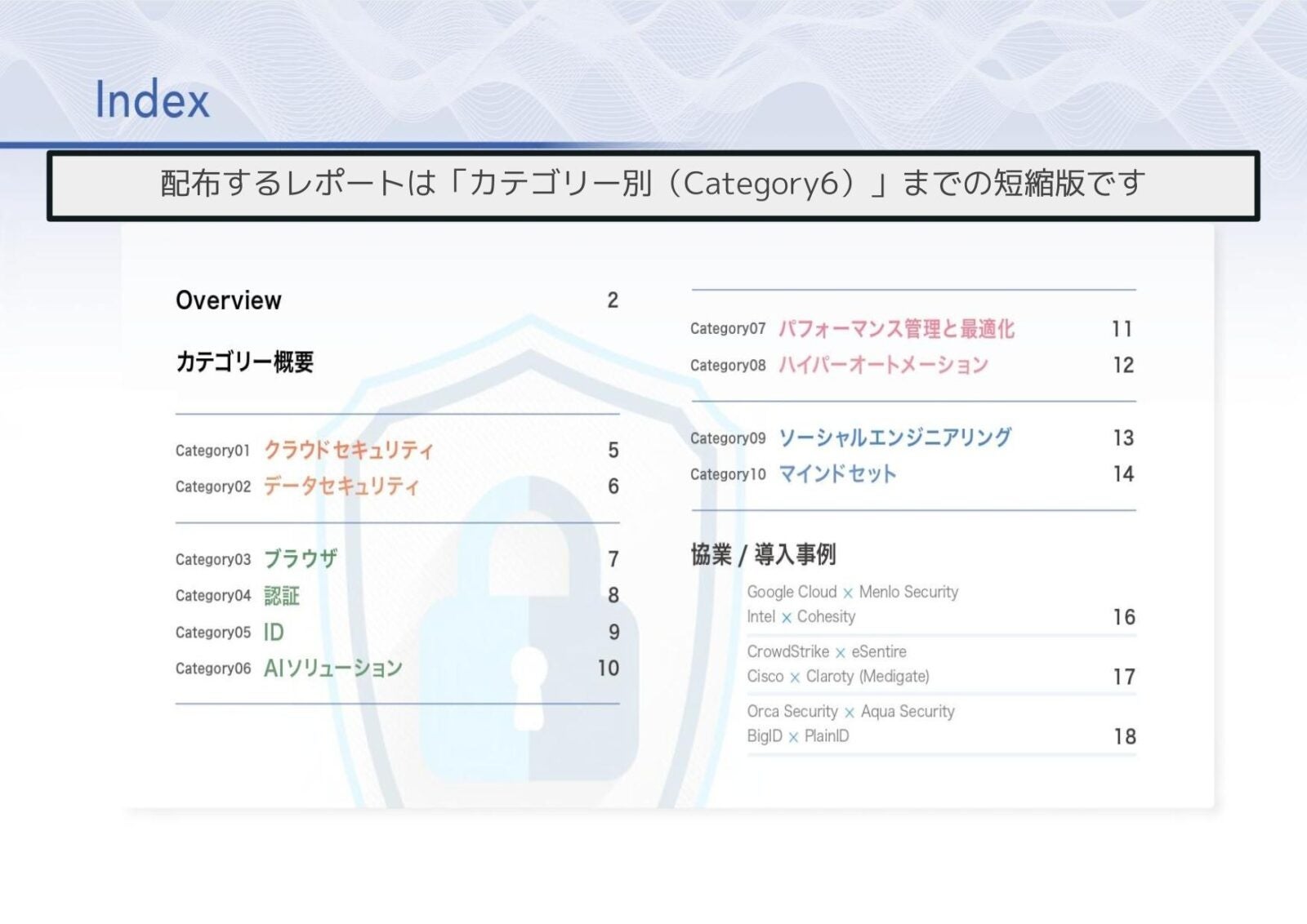 本レポートでは、サイバーセキュリティ業界で注目すべきカテゴリーと、スタートアップを掲載しています。また、大手企業と有望なスタートアップの協業/導入事例もご紹介します。