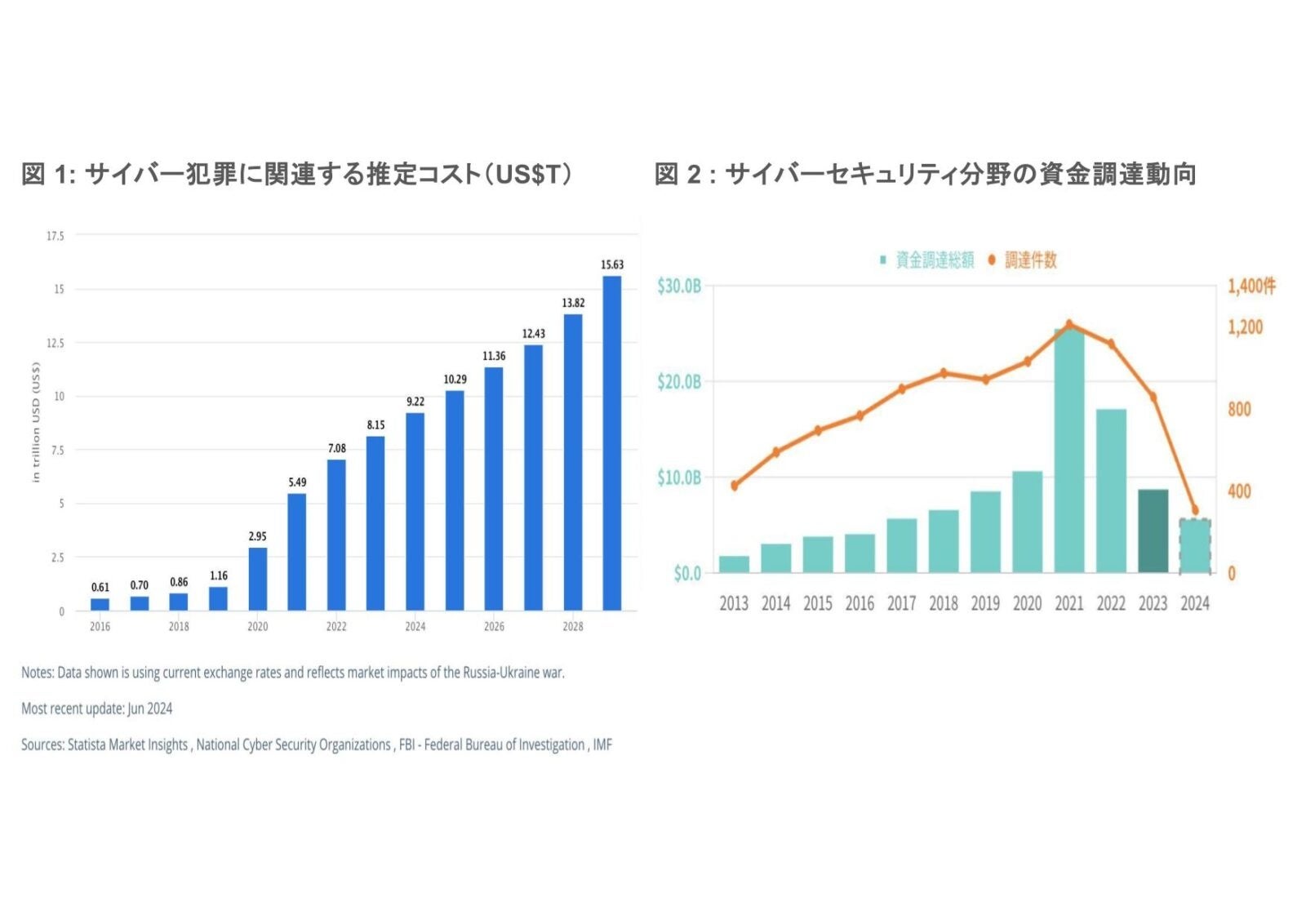 こうした状況に対応すべく、スタートアップを中心に新たなアプローチやテクノロジーが誕生しています。特に様々な産業で普及が進むAI技術は、新たなセキュリティリスクを生み出す一方で、高度な脅威検知、さらにはセキュリティのオーケストレーション/自動化による防御強化への活用が期待されています。サイバ−セキュリティ関連スタートアップの資金調達総額は、2024年上半期の時点で昨年度(年間総額)に迫る勢いを見せています(図2)。サイバーセキュリティ分野の参入プレイヤーは金融やeコマースなど他の業界に比べて限定的ではあるものの、高度な先端技術が求められる領域であるが故に、毎年$500Mから$1Bを超える大型資金調達案件がみられ、その注目度の高さが窺えます。