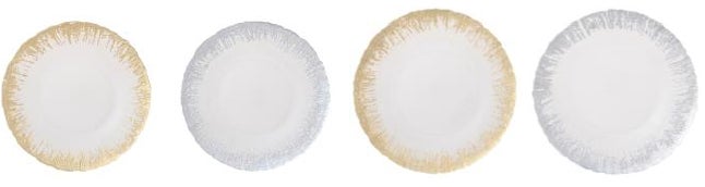裏面から吹き付けで華やかなデザインに仕上げたパーティーにぴったりのガラスプレートです。サラダやデザートなど幅広い料理にお使いいただけます。キラリと輝く縁が、食卓を華やかに彩ります。