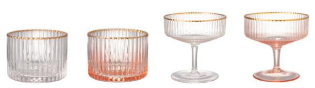 ドリンクやデザートを入れるだけで不思議とおしゃれに見えるカフェタンブラーとデザートグラスです。リムのゴールドがパーティー感を一層引き立てます。カフェタンブラーはフルーツやサラダ、冷製スープにも使える使い勝手抜群なアイテムです。デザートグラスはパフェやデザートを入れたり、カクテルグラスとしてお使いいただくのもおすすめです。