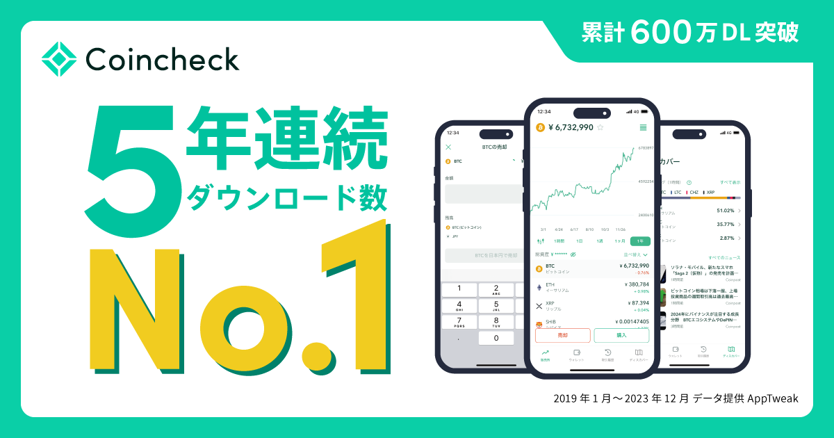 Coincheckアプリ、ダウンロード数5年連続「国内No.1」を獲得