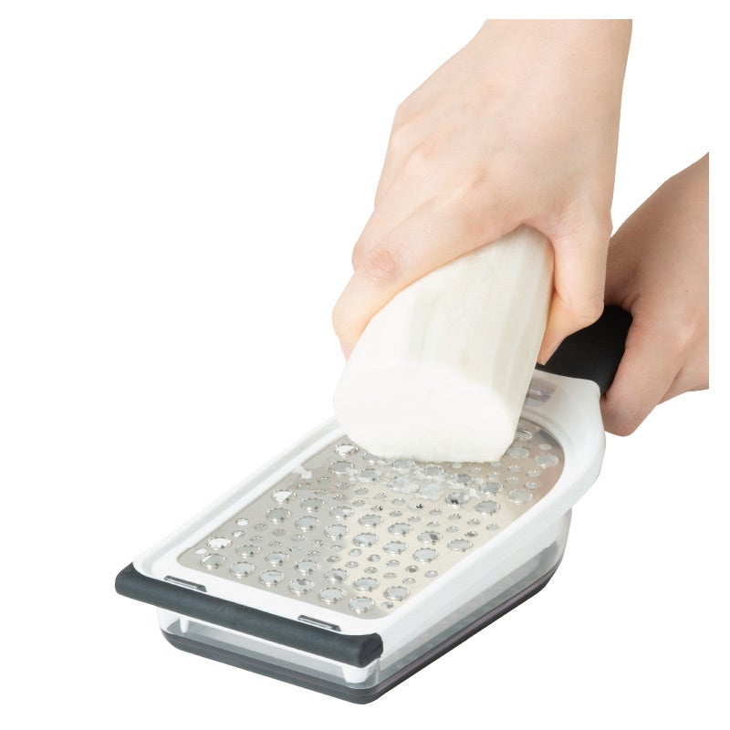 新生活で利用できる調理用品のひとつであるおろし器に注目し、デザインを統一して 清潔感のあるカラーを採用 しています。また、縦にすりおろすおろし器のほか、円を描くようにすりおろすことにで口あたりがまろやかになる丸型容器付きもご用意しています。