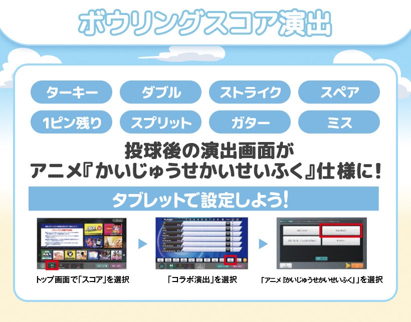 全国のボウリング96店舗にて、ボウリングスコア表示モニターでの表示演出をコラボ仕様に変更することができます。