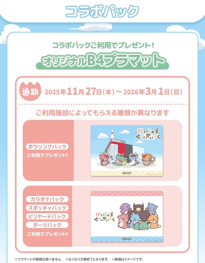 各店舗で販売するコラボパックで施設を利用していただいたお客様には、オリジナルB4プラマット(全2種)をプレゼントいたします。