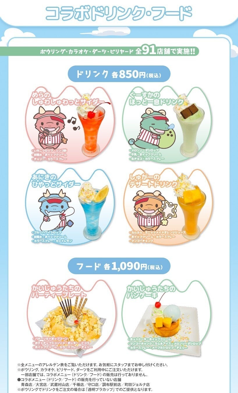 全国のボウリング、カラオケ、ダーツ、ビリヤード全91店舗でコラボドリンク・コラボフードを、スポッチャ全53店舗ではアレンジドリンクとコラボポップコーンを販売いたします。