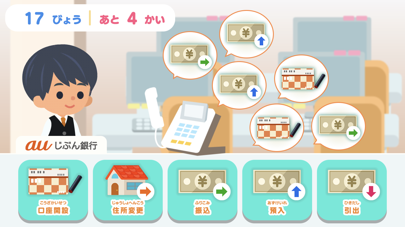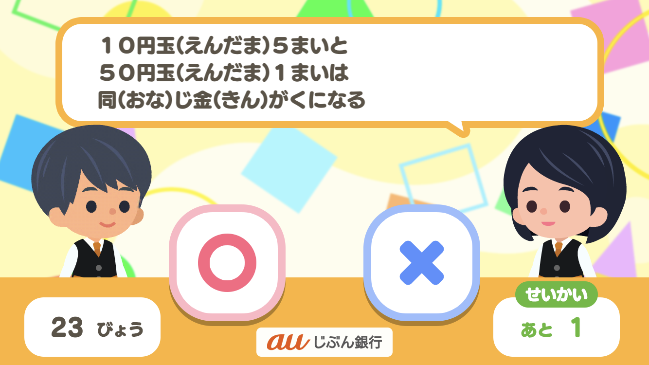 auじぶん銀行は、子どもたちの健やかな未来を創ることに貢献するため、金融機関として子どもたちに向けた金融教育の推進に取り組んでいます。このたび、マネー学習アプリとして子ども向けの金融教育やESD教育※1を推進する「まねぶー」の取り組みに、auじぶん銀行が賛同し新たに「auじぶん銀行」をアプリ内に出店します。アプリ内店舗「auじぶん銀行」では、金融に関するクイズを丸バツ形式で答える「〇×クイズ」、電話口のお客さまからの相談に回答する「コールセンター」、企業の株を保有して町を発展させていく「株投資」の3種のゲームをお楽しみいただけます。