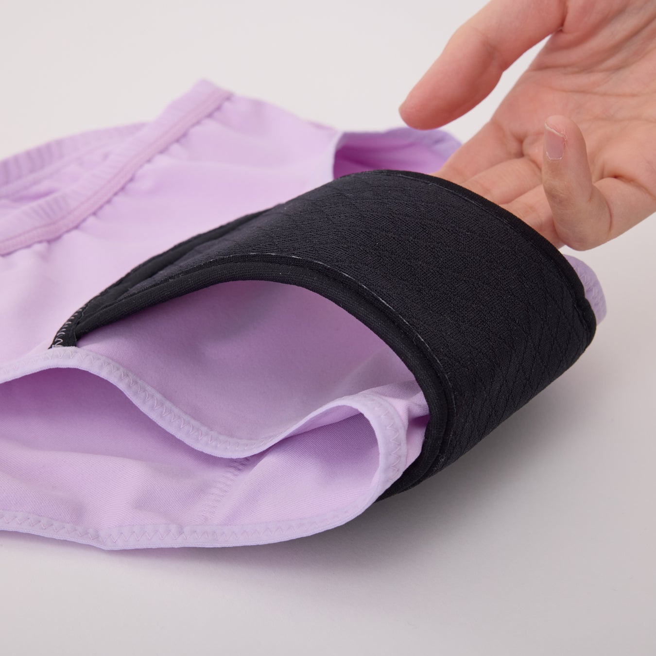 上り下りの激しい足の動きに追従するよう、吸水帯クロッチはショーツに縫いつけず独立した形に。薄手でフィット感もよく、履いた時の違和感も抑えた履き心地を実現。使い捨てのサニタリー用品との併用も可能です。