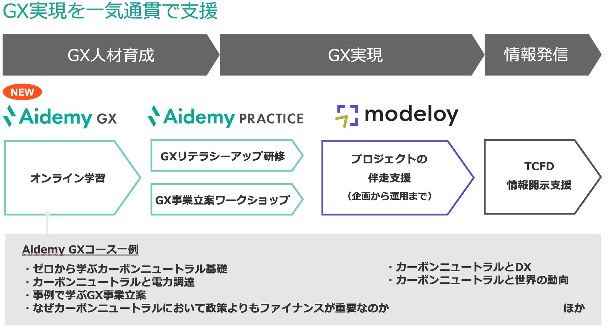 既存サービスの「GX事業立案ワークショップ」やプロジェクトの企画から運用までを一気通貫で支援するプロジェクト伴走型支援「Modeloy」と、新サービス「Aidemy GX」の連動により一気通貫の支援体制を整え、企業のGX実現をさらに推進していきます。