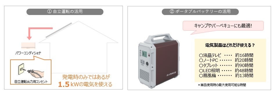 日常使用として、昼間太陽光で発電した電気をポータブルバッテリーに貯めておき夜間に利用することもできます。また、キャンプやバーベキューなど野外のレジャー時の電源としてもお使い頂けます。一方、節電が求められる緊急事態においてもテレビやLED照明にも利用が可能なため電力市場の協力体制時役立ちます。さらに、自然災害による大規模停電など万が一の際には、パワーコンディショナーを経由した自立運転での電力供給(発電時のみ)やポータブルバッテリーの活用によって、最低限の電気が使える環境を提供します。