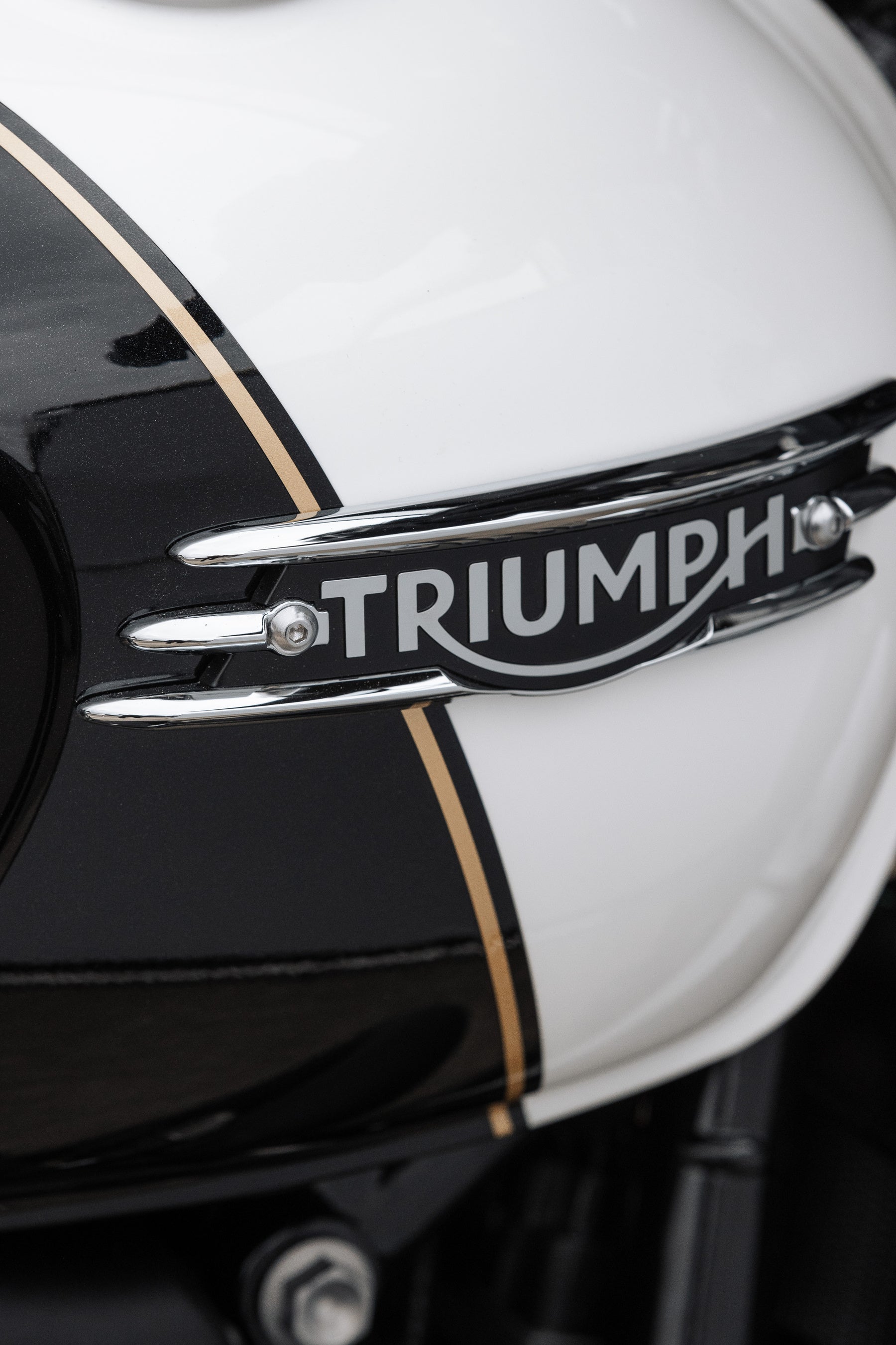 ニーパッド付きのボンネビルタンクには、3本線のヘリテージクロームメタルバッジが装着され、T120のデザインに独特のスタイリングが加えられています。