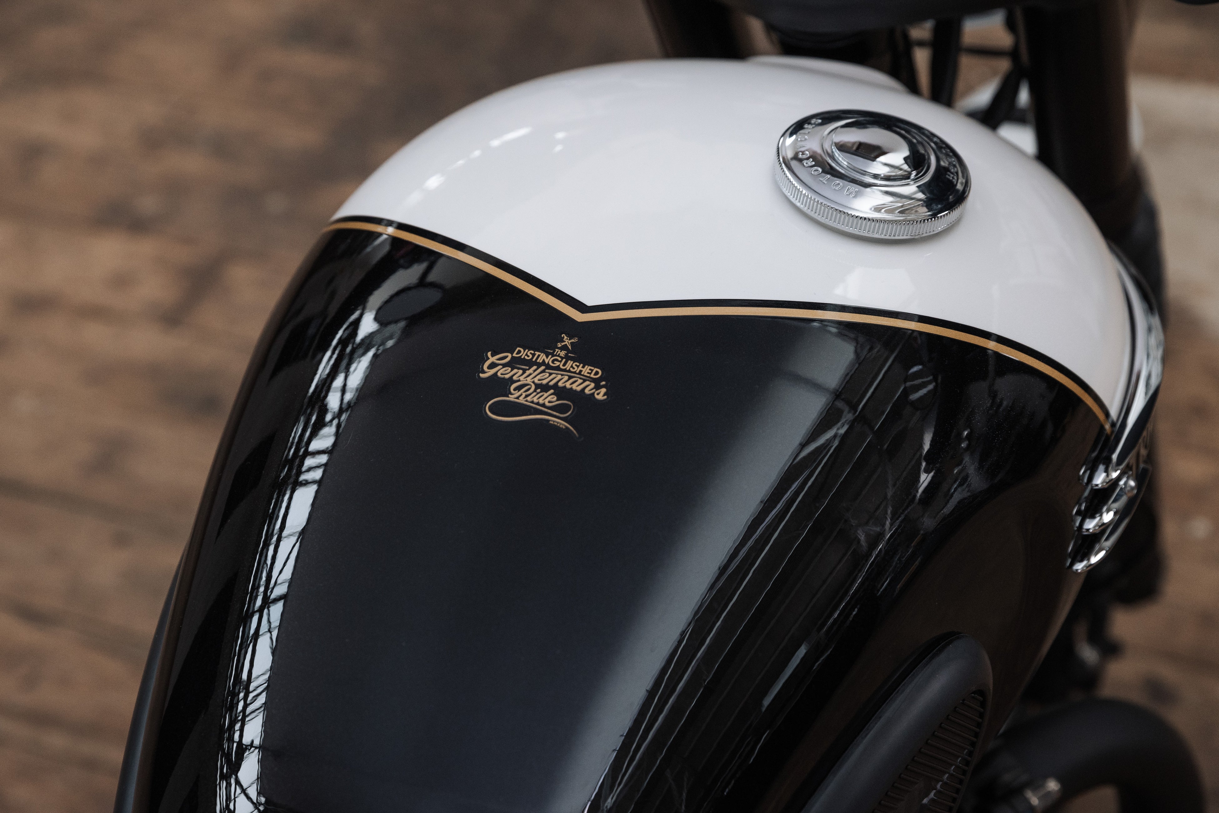 美しいゴールドの燃料タンクストライプとサイドパネルの手描きゴールドピンストライプは、DGRの粋な服装とアクセサリー(クラシックなゴールドの懐中時計やタイピンなど)からインスパイア