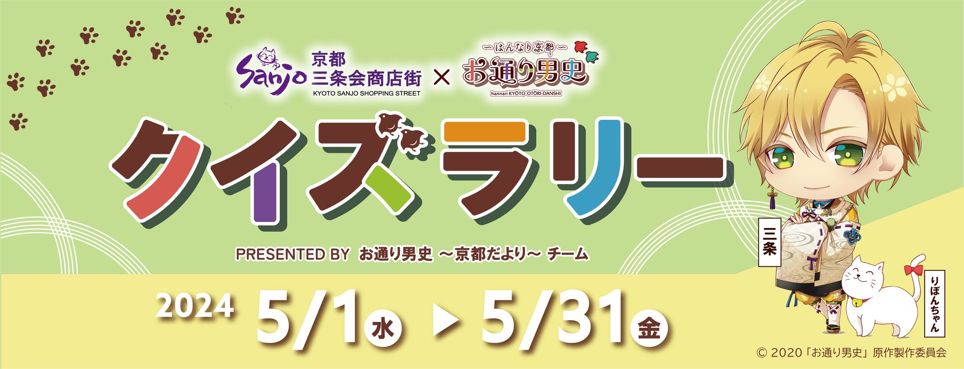 本プロジェクトの一環として、京都の商店街とのコラボレーション企画「京都三条会商店街×お通り男史 クイズラリー」 を、5月1日(水)から5月31日(金)までの1ヵ月間実施します。