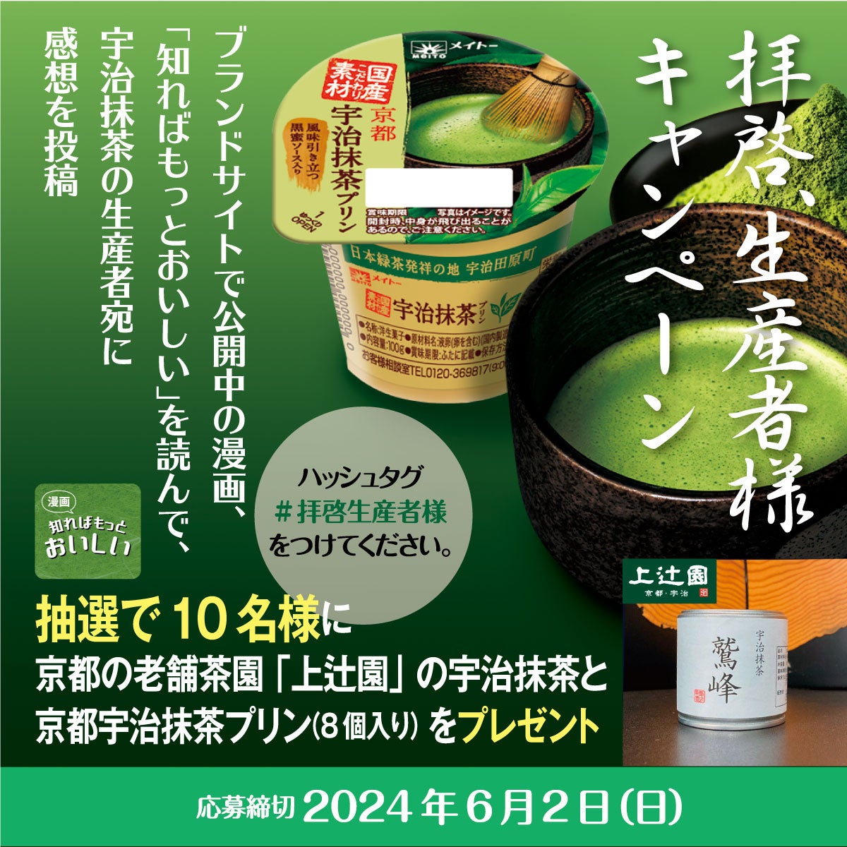 ブランドサイトで公開中の漫画「知ればもっとおいしい」を読んで、宇治抹茶の生産者宛に感想をX(旧Twitter)に投稿していただいた方の中から、抽選で10名様に京都の老舗茶園「上辻園」の宇治抹茶と京都宇治抹茶プリン(8個入り)をプレゼントするX(旧Twitter)キャンペーンを実施いたします。