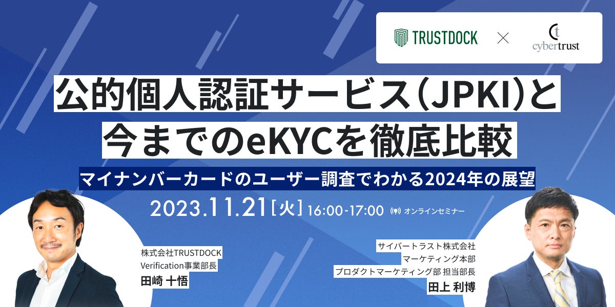 TRUSTDOCK × サイバートラスト、「公的個人認証サービス(JPKI)と今までのeKYCを徹底比較」ウェビナーを2023年11月21日に開催