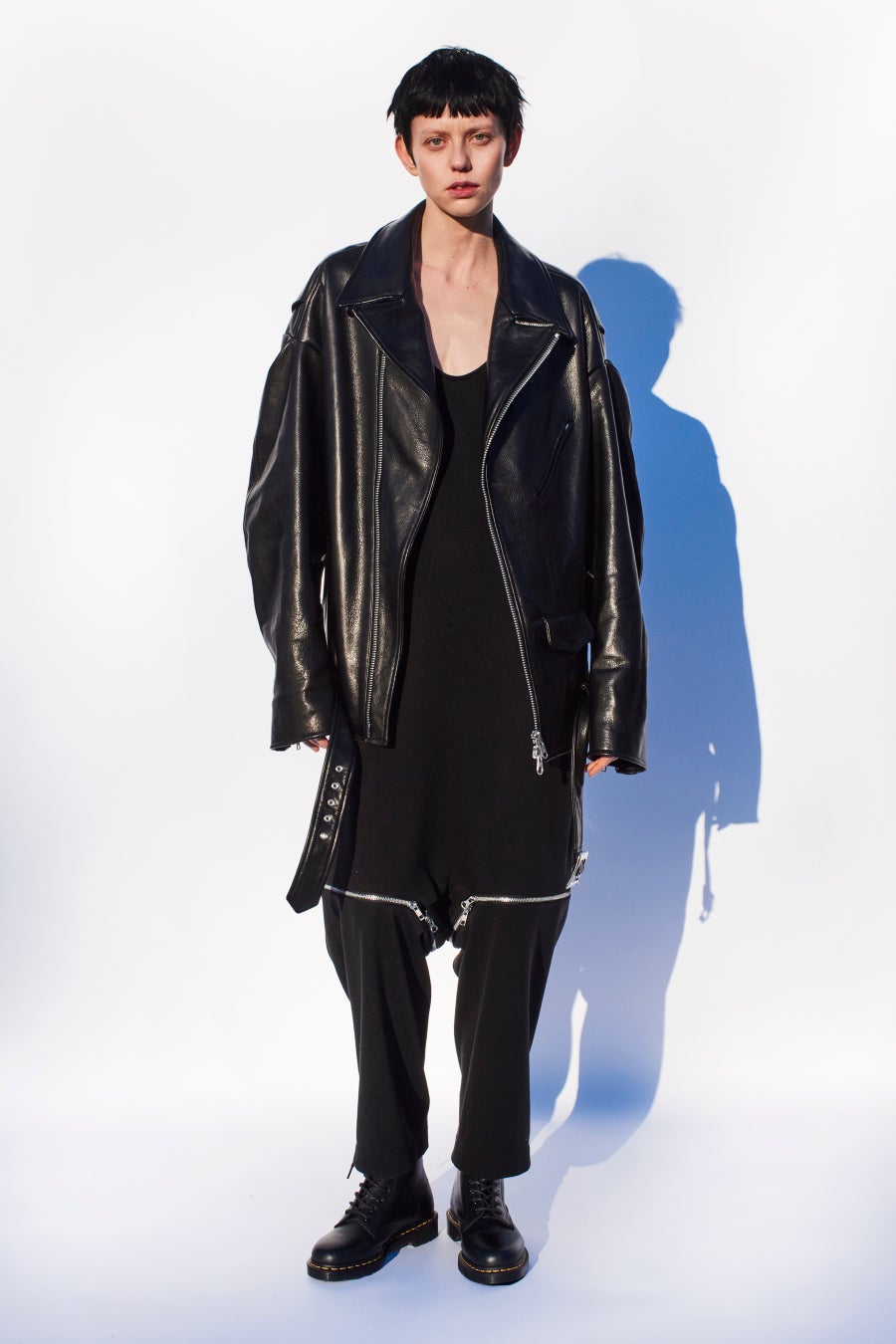 ヴィンテージのアンダーウェアを着想源としたタンクスーツ型ドレスに、極端なオーバーサイズで表現された、ライダースジャケット。袖付けにマチが入ったドロップショルダーで、メンズライクで力強いラインが強調されたボリュームシルエットに仕上げられたライダースは、男性でも着られるサイズ感。クラシカルでイージーなムードのドレスが、強いジャケットを馴染んだスタイルへ導きます。