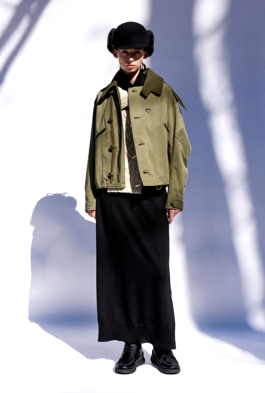 ミリタリーに由来する形式のあるフォルムの服を、テーラードやクチュールの要素で整理し、再構成した表現。