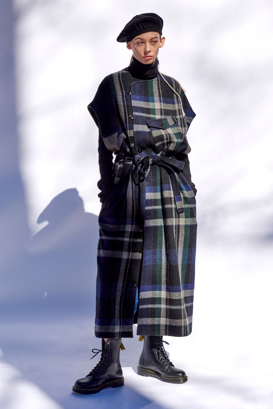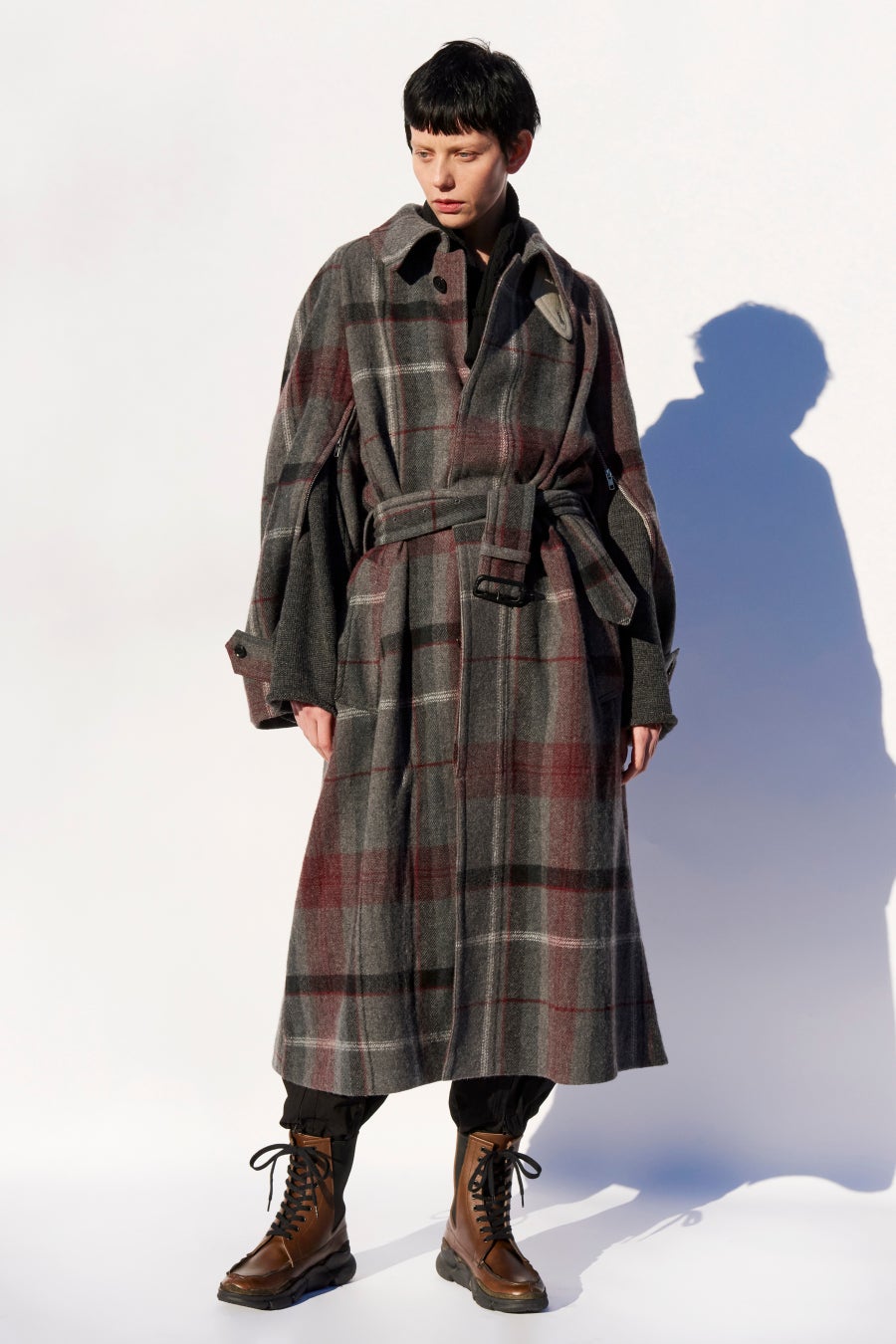 ざっくりと織り上げた大柄のチェックツイルをふんわりと縮絨することで軽くて暖かいブランケットの様な仕上げの生地で仕立てられた、モダンなコート。ローゲージニットとのコンポジションで、袖のファスナーを開いてスリットから腕を出すとケープをまとったようなボリュームのあるフォルムへ。男物のような力強いラインの襟が全体の印象を引き締め、強くモダンなシルエットに導いています。クラシックチェックで描かれる今シーズンのシグネチャー・ピースの一つ。