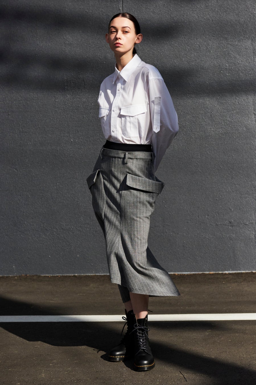メンズを着ているような、身頃幅、アームホールともにやや大きめで肩は自然にドロップショルダーになる、程よくゆとりの入った分量のシャツ。ユニフォームを思わせるアウトポケットが付き、引き締まった印象に仕上げます。馴染んだ表情の紳士服のようなストライプ生地のウールで仕立てられたスカート。アンダーパンツが覗いたようなディテールのスポーティな素材感と、ローライズシルエットをクラシカルなマーメイドスカートと掛け合わせた、スポーツテイストとクラシックの新しいバランス。