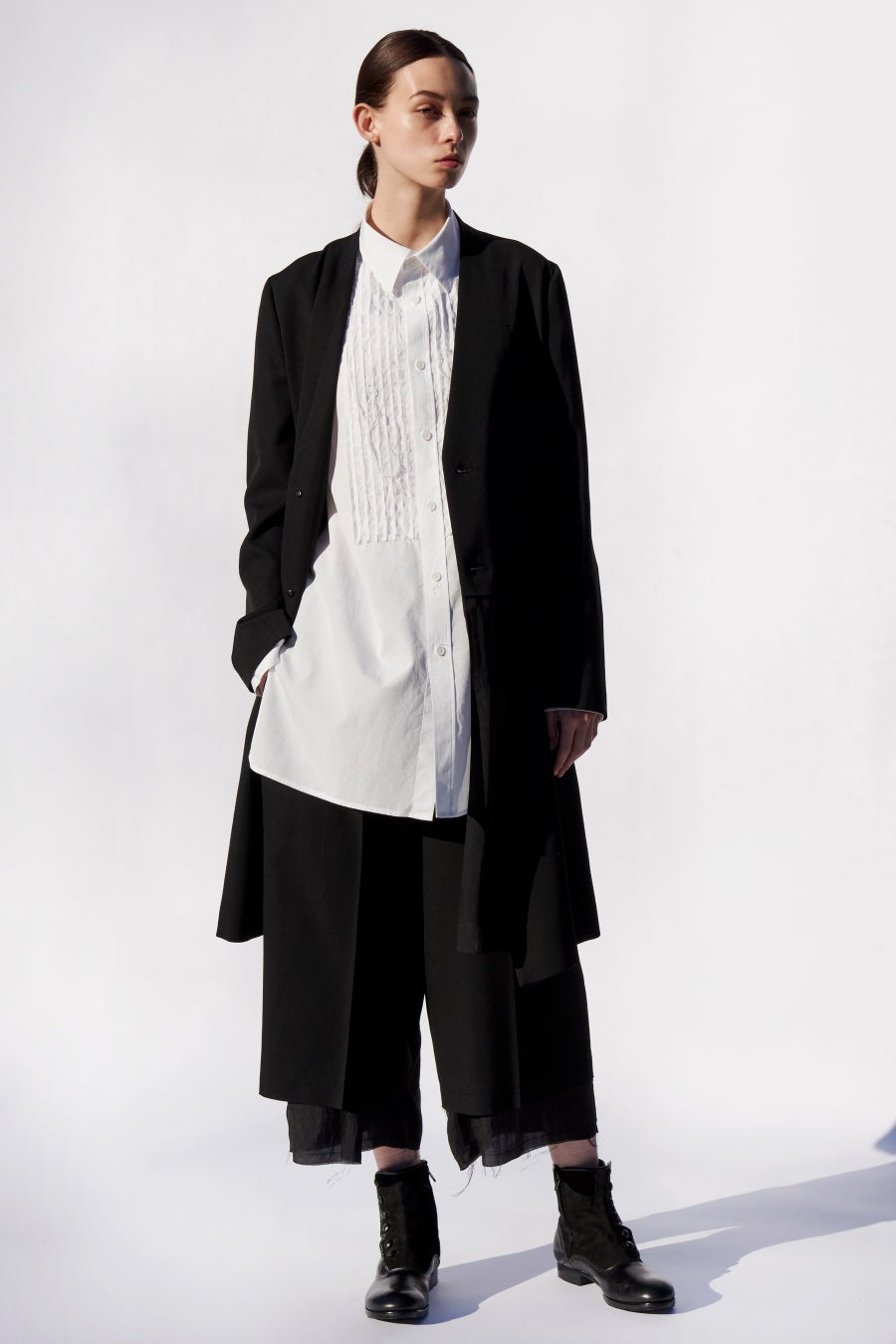 片側の襟が外れている様にダブルになったジャケット。極端なローライズパンツから重ね履きしたアンダーパンツを覗かせたような二重仕立てのパンツ。遊びのあるディテールが、オールブラックのジャケットパンツスタイルを、奥行きのあるシルエットに描きます。
