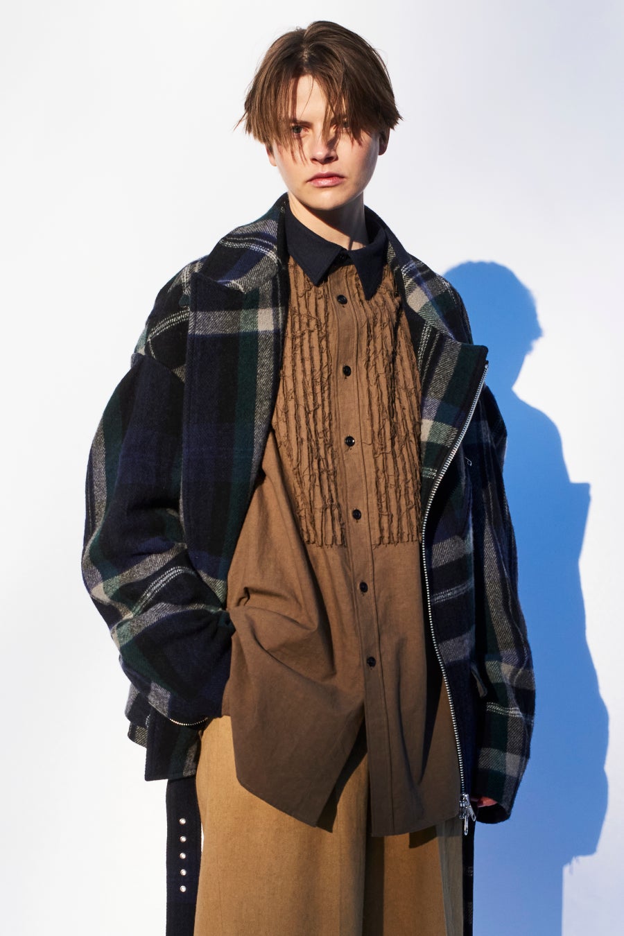 クラシックチェックでブランケットのような風合いに仕上げられたウールで仕立てられたボリュームシルエットのライダースジャケットは、包まれる様なあたたかな表情。襟がフラノウールでボディはヴィンテージ感のあるダンガリーコットン、裁ち切られたテープ状の布をたたき付けてピンタック風になったブラウス。ブラウンとチェックのウィンターレイヤード。