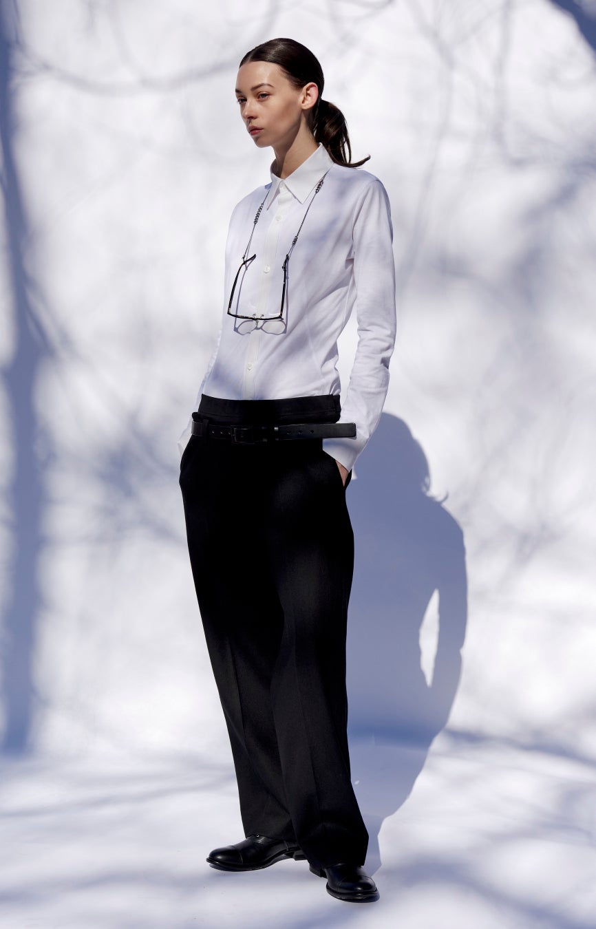 ダーツで絞ったスリムフィットシルエットが特徴のドレスシャツと、オーセンティックなチノパンをモダンにアップデートした極端なローライズシルエットのパンツ。2種類のコットンで構成されたシャツは、身頃と袖に綿天竺を、襟と前立て、カフスにはブロードを使用しシャツらしい端整な印象を残しています。マットな光沢のあるフラノ生地の上品さのある綺麗すぎない独特な風合いの生地感が、テーラードのような雰囲気と、くだけたニュアンスを同時に見せるパンツの表情。ディテールの細やかな作り込みが印象を複雑にし、奥行きのあるスタイルをつくります。