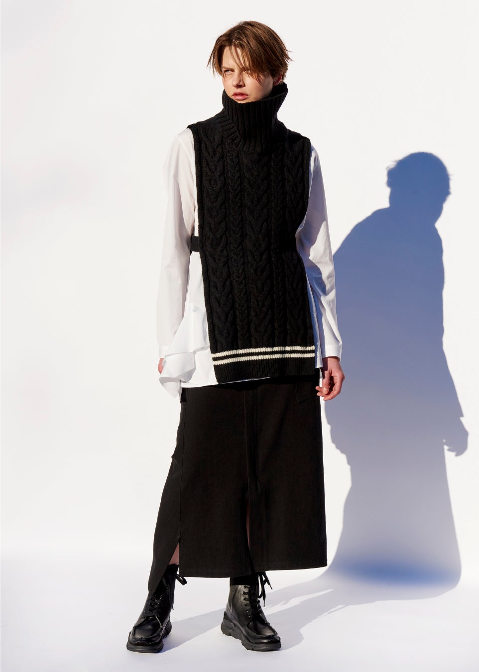 タートルベストのスリットから覗く、ブラウスに取り付けられた印象的なポケットのディテール。デニムパンツをイメージして全体がゆがんだりちぐはぐになるようなデザインのスカートは、ニュートラルな印象で、ファスナーを下から開けてスリットをつくり、ボトムスを重ねるレイヤードスタイルを楽しむことも可能です。