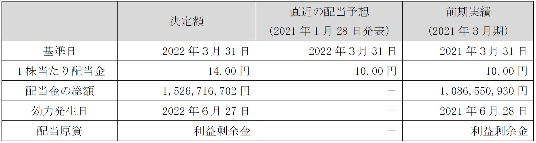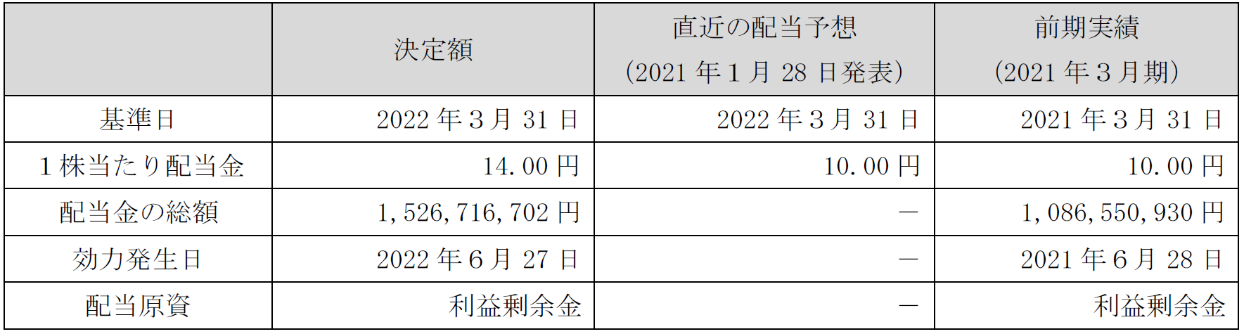 この度の業績予想の修正を踏まえ、上記方針に基づき、2022年3月期における期末配当を、直近の配当予想の1株当たり10円から4円増配し、1株当たり14円とさせていただきます。