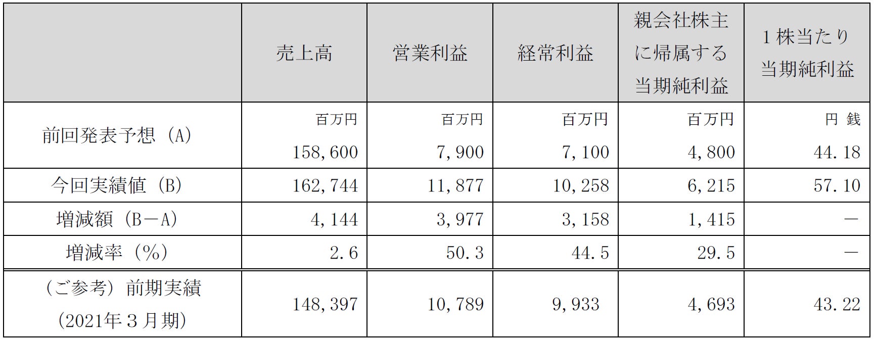 2021年5月14日に公表いたしました2022年3月期の通期連結業績予想と本日公表の実績値に差異が生じましたので、下記のとおりお知らせいたします。
