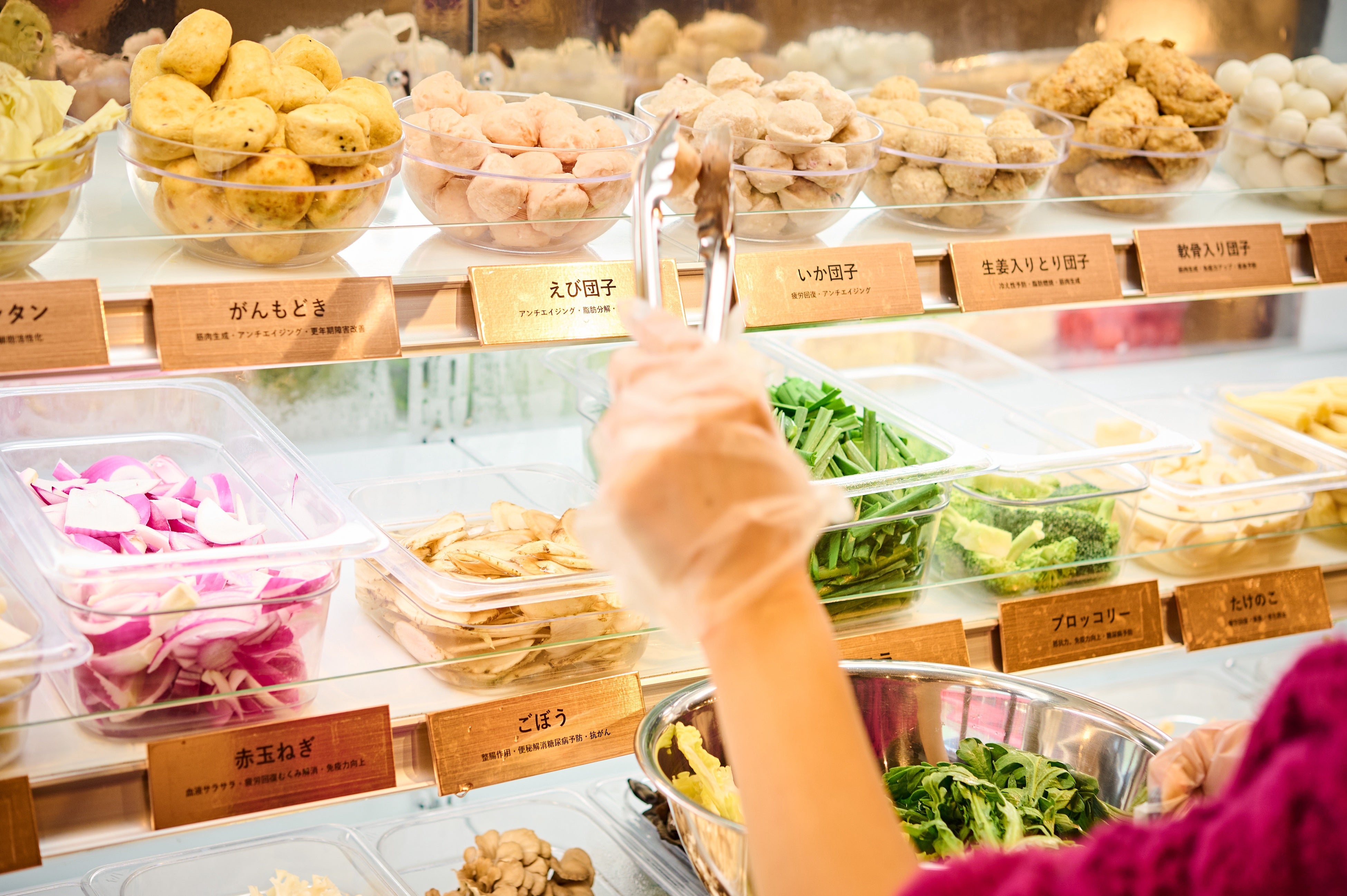 店内の冷蔵ケースに並べられた野菜や具材から