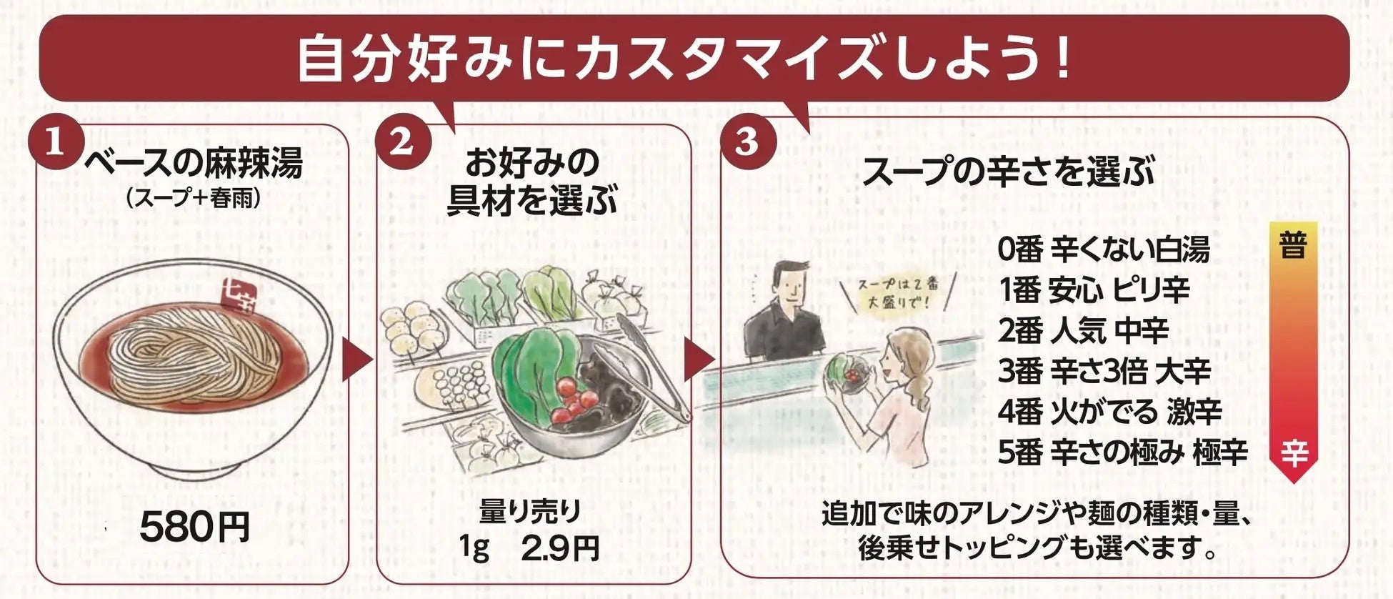 スープの辛さは0から5辛をベースにご用意。